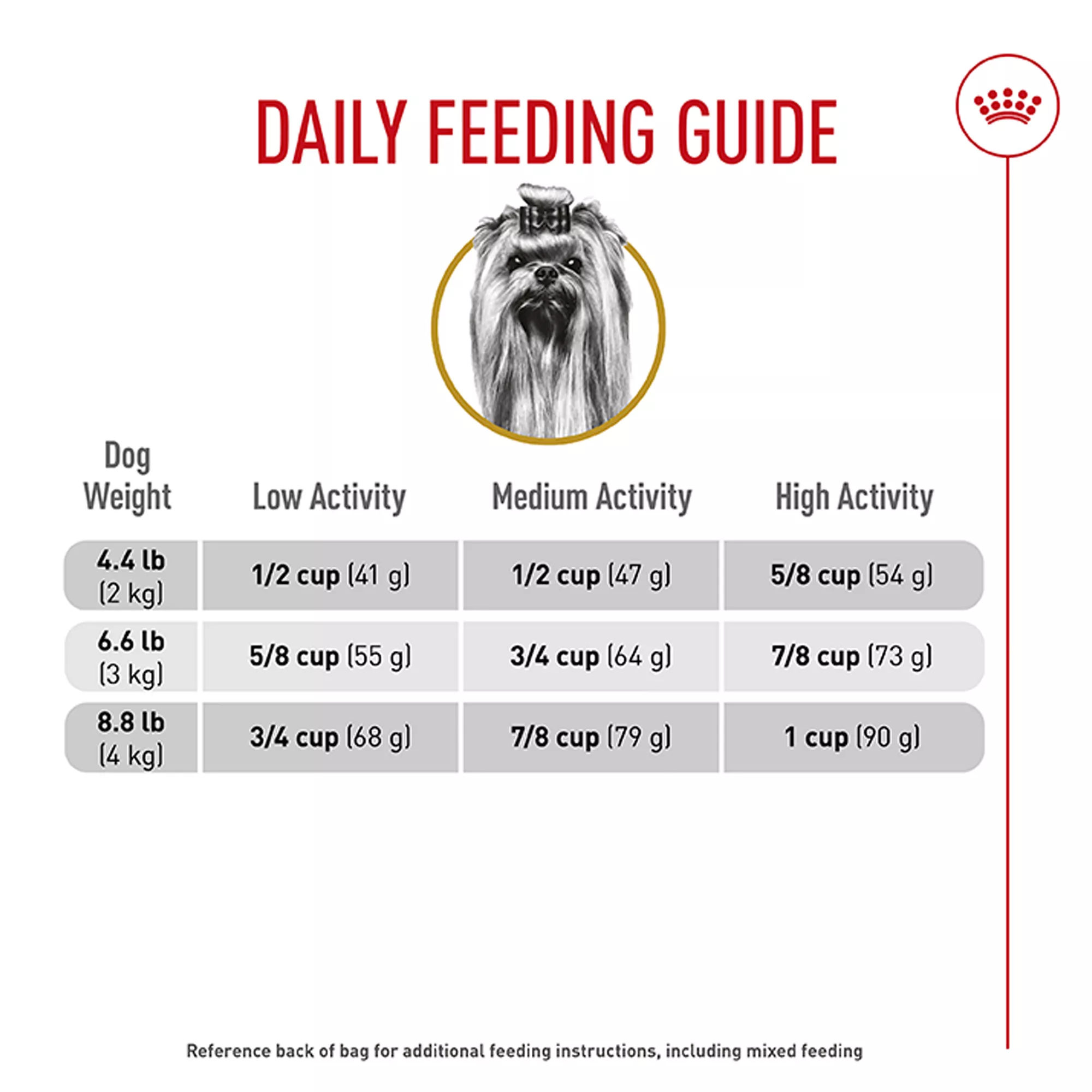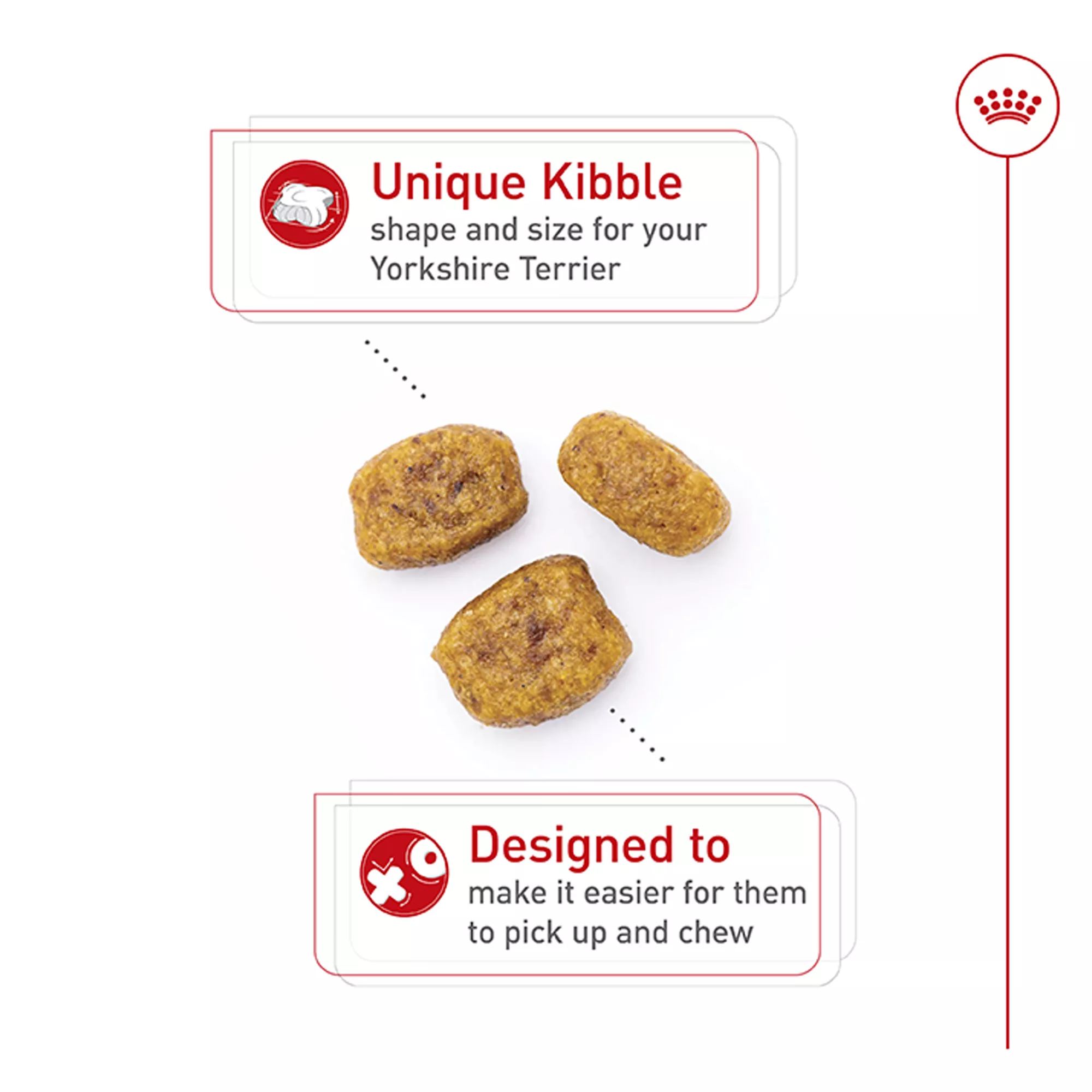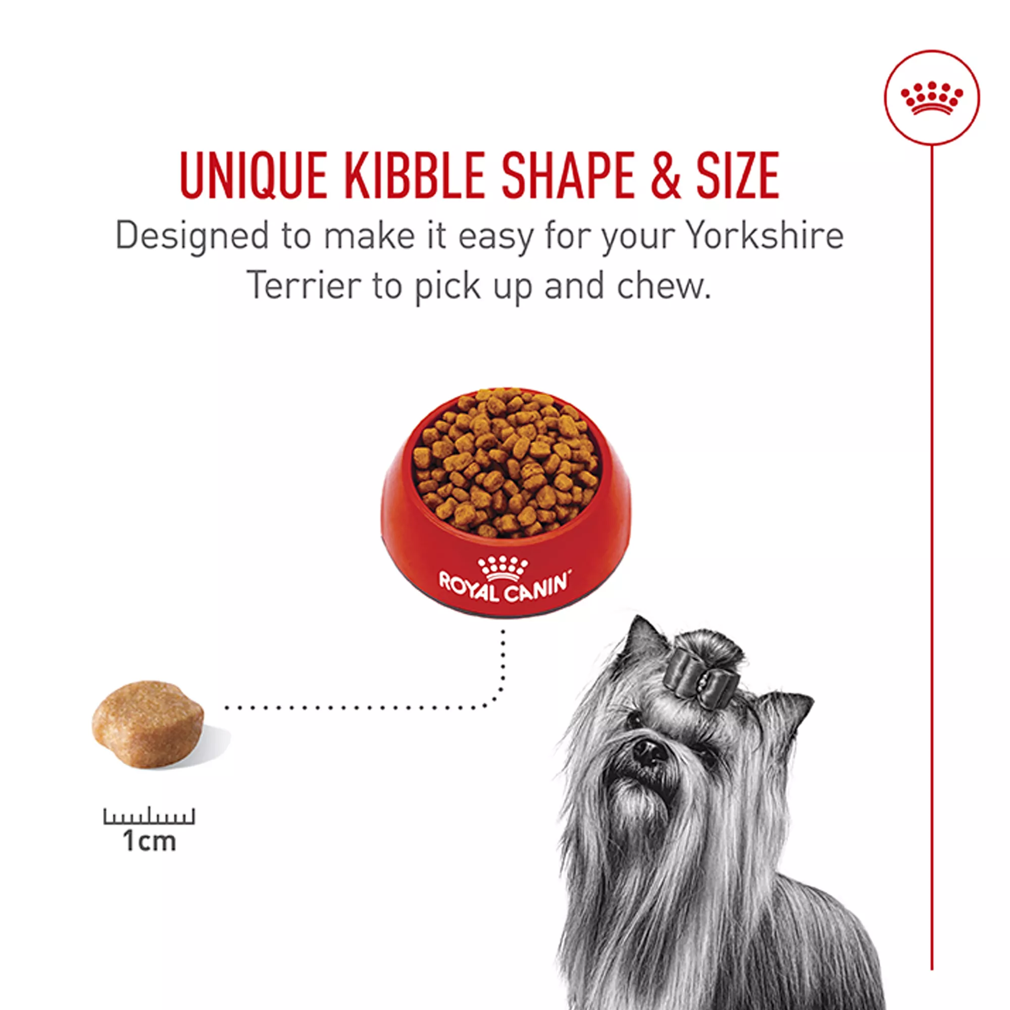 for your toy breed’s small jaw, making it easy for them to pick up and chew. Not only that, but this complete and balanced adult dog food provides the nutrition to help your best friend thrive. The kibble’s shape, size, texture and formula are adapted to the Yorkshire Terrier, helping reduce tartar formation by encouraging the dog to chew. Biotin, omega???3 and omega???6 fatty acids help maintain healthy skin and coat. Targeted nutrients including vitamin C, EPA and DHA help support your Yorkshire Terrier’s vitality. Serve your Yorkshire Terrier Royal Canin Dry Dog Food and promote your dog’s overall wellness with every meal.