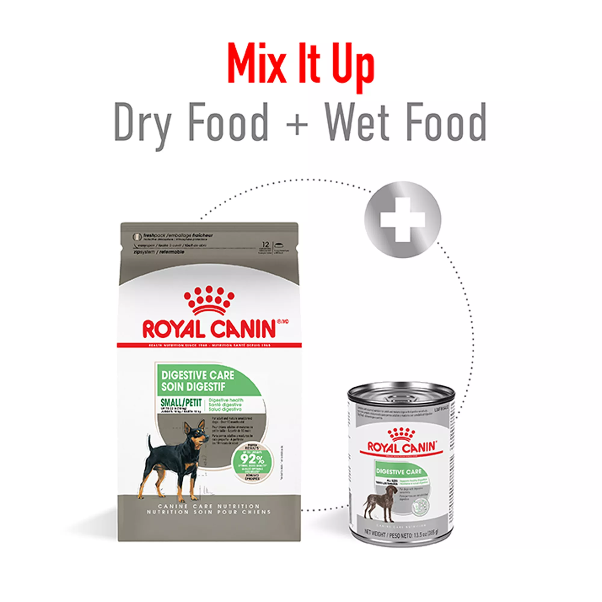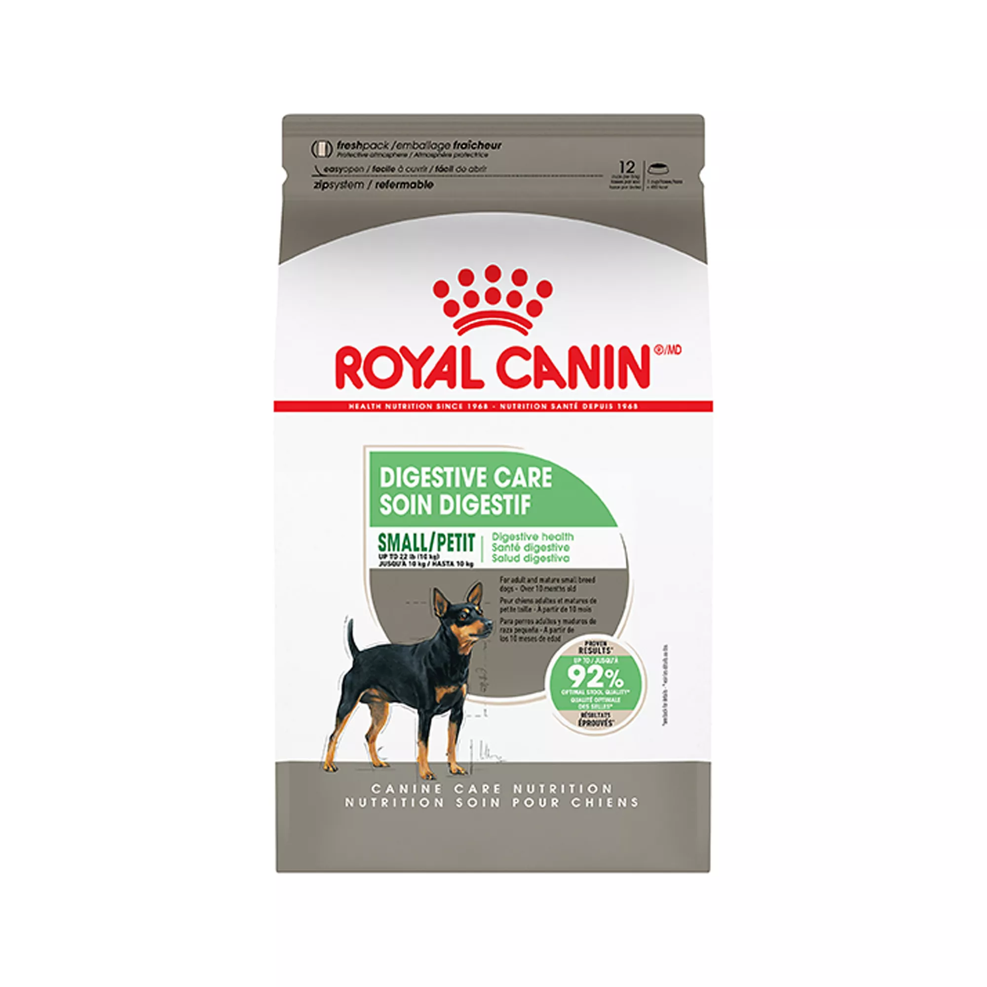 optimal stool quality. In fact, 92% of small dogs fed Digestive Care had optimal stool quality, a clear sign of positive digestion health. Mix this dry food with Royal Canin Digestive Care Wet Adult Dog Food in can or pouch for a variety of textures to please picky eaters.