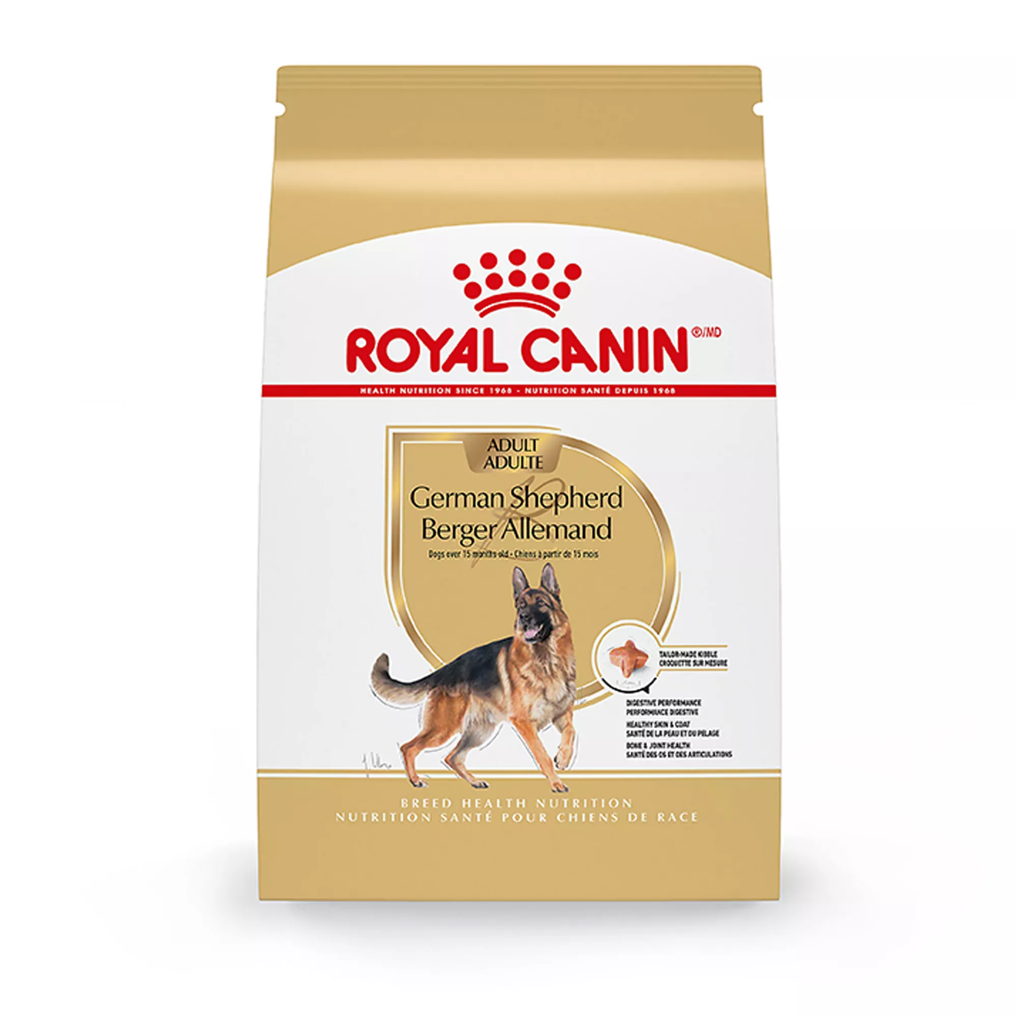 Description: Serve up the tailored nutrition your German Shepherd deserves with Royal Canin(R) Breed Health Nutrition German Shepherd Adult Dog Food Dry Formula. Royal Canin makes it easier than ever to feed your dog tailored dog food. This German Shepherd food features a specialized kibble shape and texture designed for your German Shepherd’s long, strong muzzle and teeth. Not only that, but this complete and balanced adult dog food provides the nutrition to help your best friend thrive. Highly digestible proteins and specific fibers help maintain digestive health, while exclusive nutrients help support the skin’s barrier. EPA and DHA from fish oil in the dog kibble help maintain skin and coat health, and glucosamine and chondroitin help support bone and joint health in big dogs. Serve your German Shepherd Royal Canin Dog Food and promote your dog’s overall wellness with every meal.