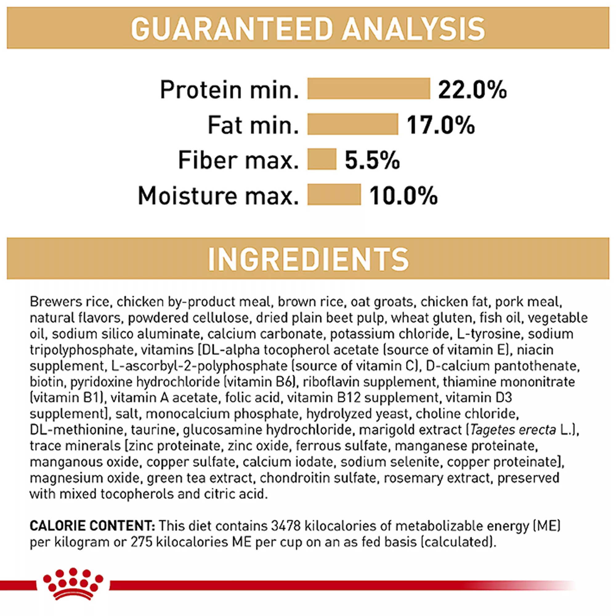 Ingredients: Brewers rice, chicken by?product meal, brown rice, oat groats, chicken fat, pork meal, natural flavors, powdered cellulose, wheat gluten, dried plain beet pulp, fish oil, vegetable oil, sodium silico aluminate, coprah oil, calcium carbonate, potassium chloride, L?tyrosine, salt, sodium tripolyphosphate, taurine, hydrolyzed yeast, vitamins [DL?alpha tocopherol acetate (source of vitamin E), inositol, niacin supplement, L?ascorbyl?2?polyphosphate (source of vitamin C), D calcium pantothenate, biotin, pyridoxine hydrochloride (vitamin B6), riboflavin supplement, thiamine mononitrate (vitamin B1), vitamin A acetate, folic acid, vitamin B12 supplement, vitamin D3 supplement], choline chloride, DL?methionine, glucosamine hydrochloride, marigold extract (Tagetes erecta L.), monocalcium phosphate, trace minerals [zinc proteinate, zinc oxide, ferrous sulfate, manganese proteinate, manganous oxide, copper sulfate, calcium iodate, sodium selenite, copper proteinate], tea, chondroitin sulfate, rosemary extract, preserved with mixed tocopherols and citric acid.