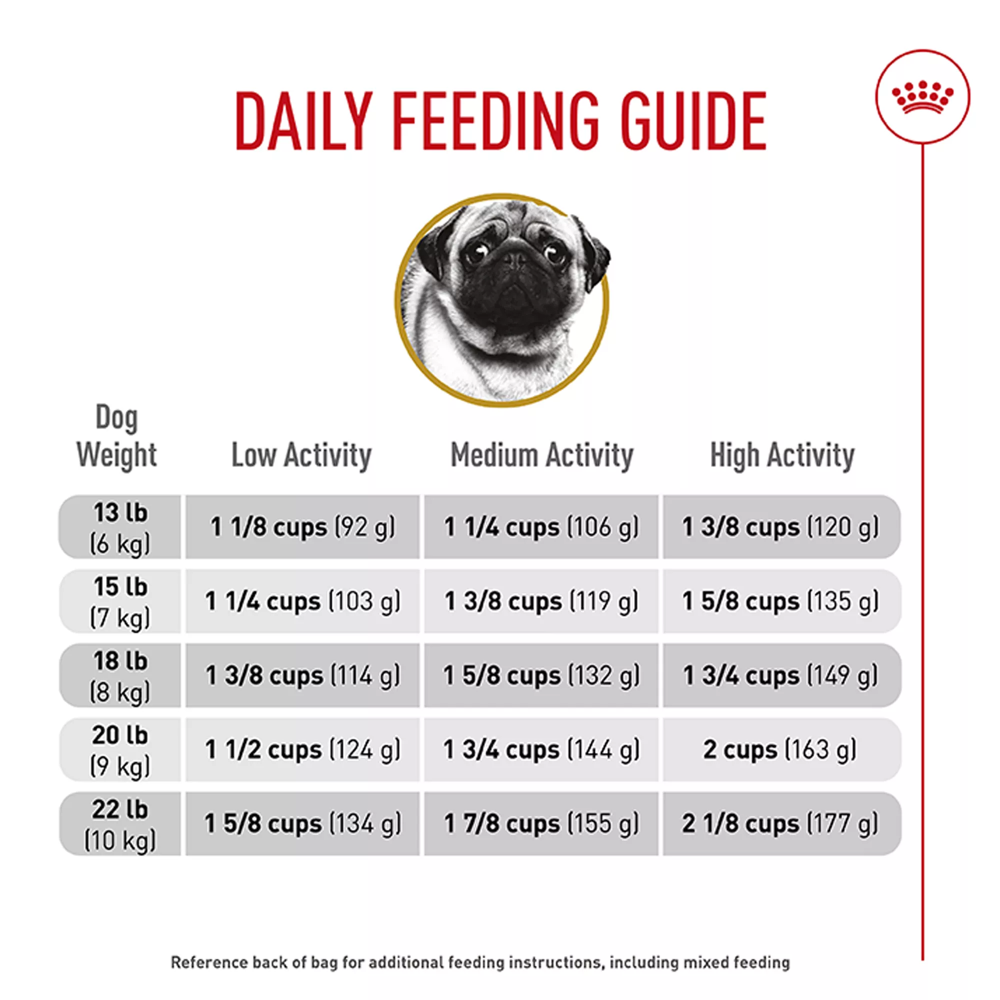 Description: Serve up the tailored nutrition your Pug deserves with Royal Canin(R) Breed Health Nutrition Pug Adult Dog Food Dry Formula. Royal Canin makes it easier than ever to feed your dog tailored dog food. This Pug food features a specialized cloverleaf kibble shape designed for your Pug’s short, square muzzle, making it easy to pick up and chew. Not only that, but this complete and balanced adult dog food provides the nutrition to help your best friend thrive. EPA and DHA from fish oil in the dog kibble help provide skin support and coat care, while precise protein levels and added L?carnitine provide muscle support. The appropriately balanced healthy dog food formula helps provide weight management to keep your playful Pug at a healthy weight. Plus, Royal Canin conducts regular audits to ensure healthy dog food safety, traceability and quality. Serve your Pug Royal Canin Dog Food and promote your dog’s overall wellness with every meal.