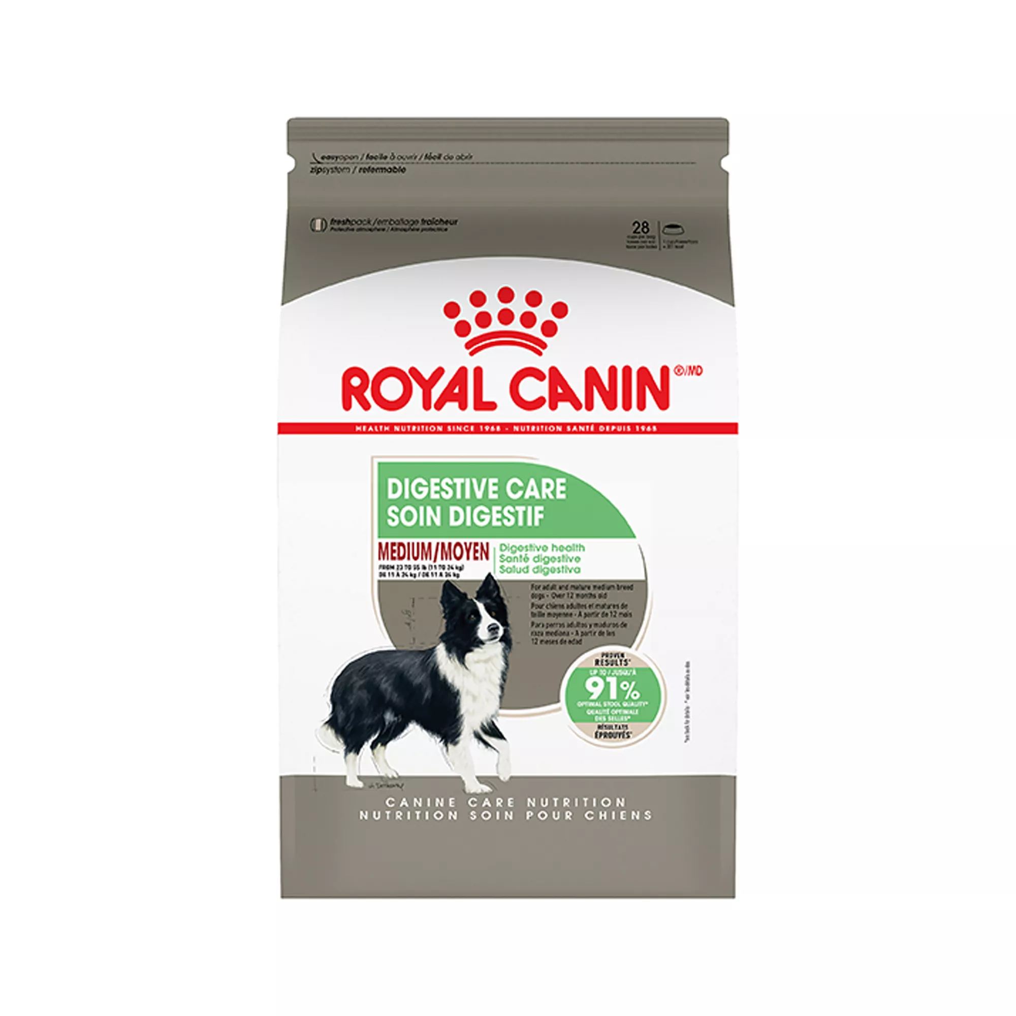 FOR MEDIUM DOGS WITH SENSITIVE STOMACHS: Royal Canin Medium Digestive Care Dry Dog Food is formulated for medium dogs 12 months and older weighing 23-55 lb with a sensitive stomach