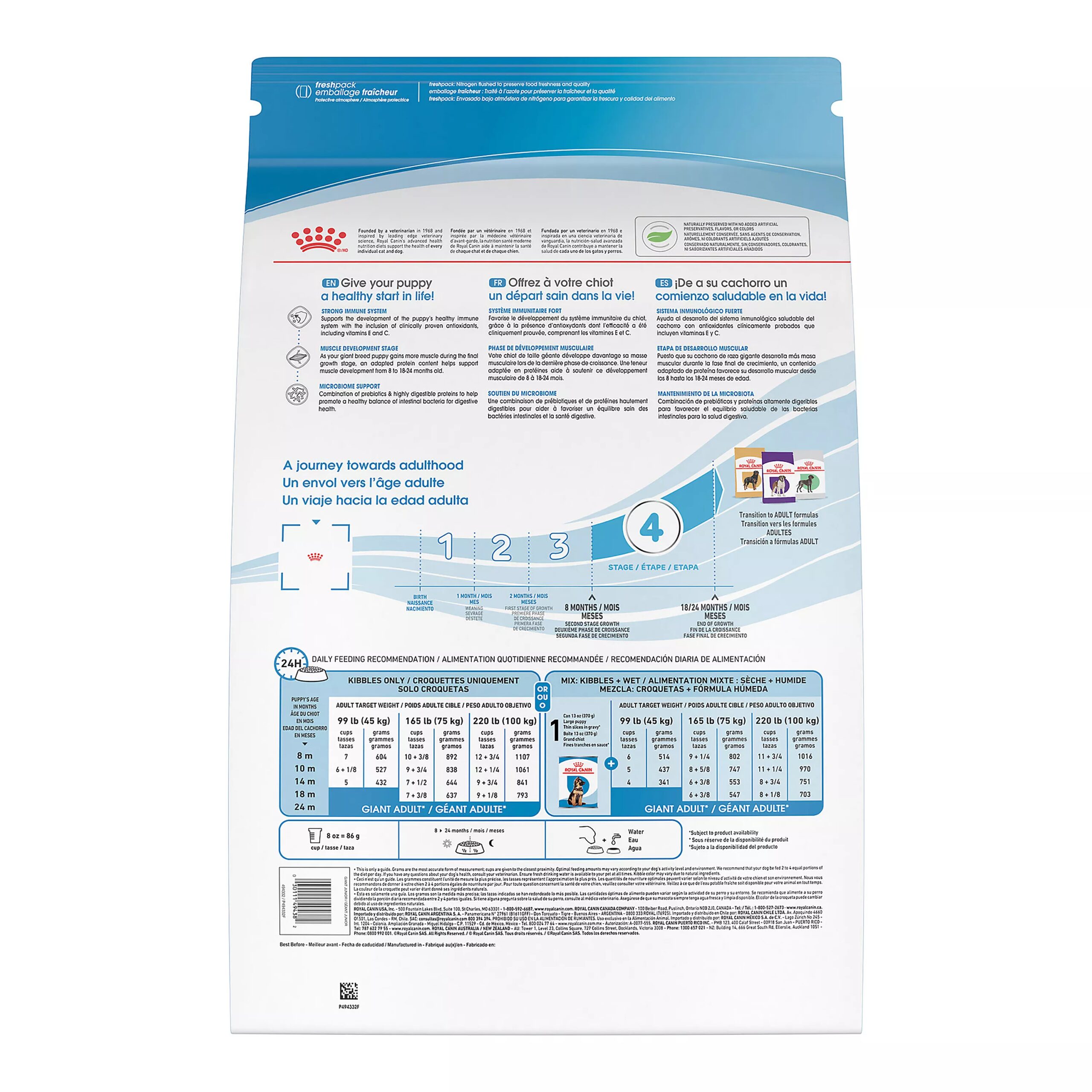 Royal Canin Giant Junior is a nutrient-dense diet formulated for that second stage of growth. An adapted protein content supports muscle development. A combination of prebiotics and highly digestible proteins helps promote a healthy balance of intestinal bacteria for digestive health. And clinically proven antioxidants, including vitamins E and C, support the healthy development of immune systems. Depending on your giant dog’s development, keep them on this dry puppy dog food until 18-24 months. Then switch to Royal Canin Giant Adult Dry Dog Food for continued tailored nutrition.