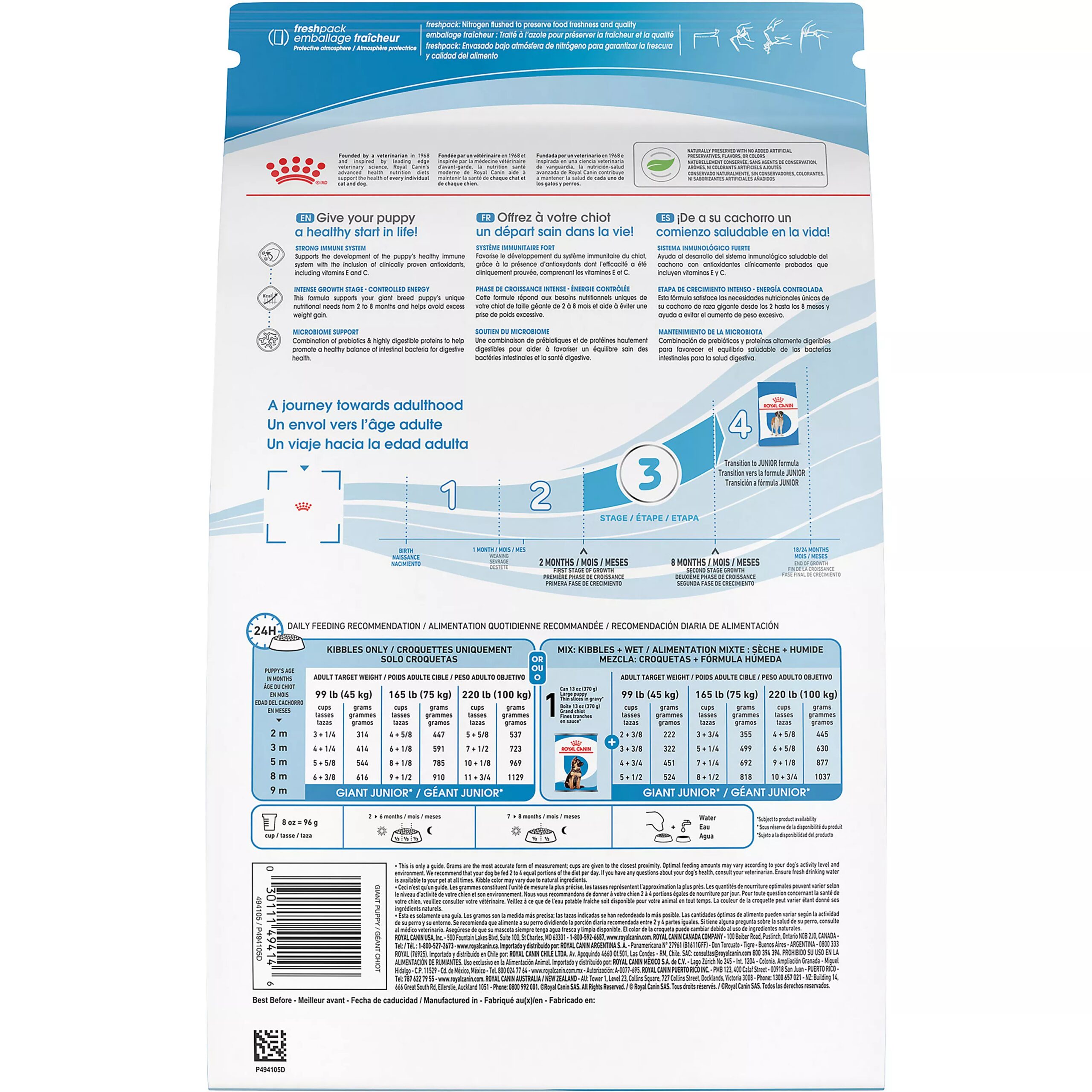Serve up the targeted nutrition your puppy deserves with Royal Canin Size Health Nutrition Giant Breed Dry Puppy Food. Royal Canin makes it easier than ever to feed your puppy dry dog food. This extra-large breed puppy food formula features a crunchy puppy kibble texture your puppy will love. Not only that, but this complete and balanced, Royal Canin dog food is designed to meet your puppy’s unique nutritional needs from 2 to 8 months to support the intense growth stage and control excess weight gain. DHA and omega-3 fatty acid help with your puppy’s brain development as they go through their puppy training stage. Antioxidants such as vitamins E and C help with immune support, and a combination of prebiotics and highly digestible proteins promotes healthy dog food digestion. A specialized blend of minerals provides bone and joint support. Promote your puppy’s overall wellness with every Royal Canin Giant Breed Dry Puppy Food serving.