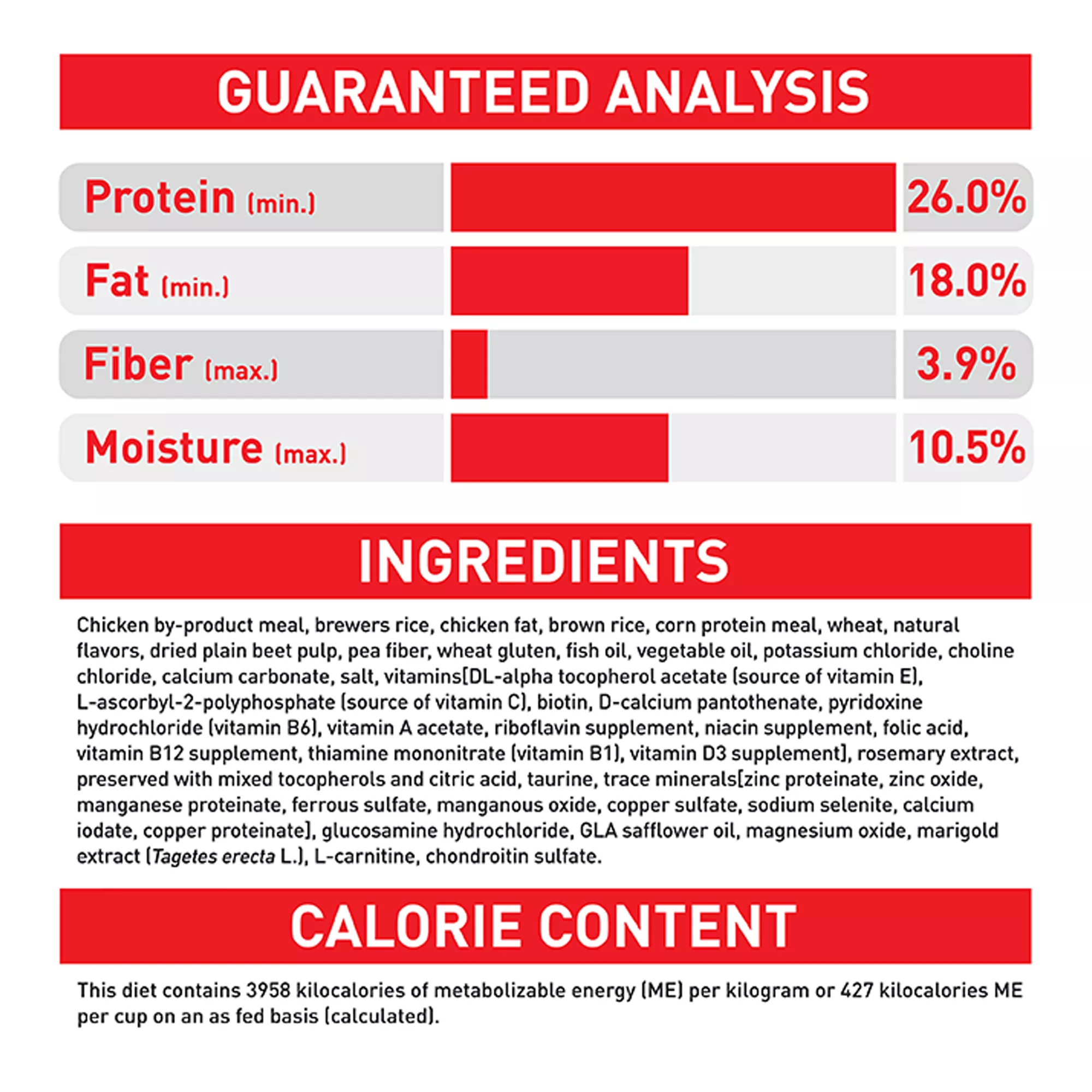 Guaranteed Analysis: Crude Protein (min.)26.0%, Crude Fat (min.)18.0%, Crude Fiber (max.)3.9%,