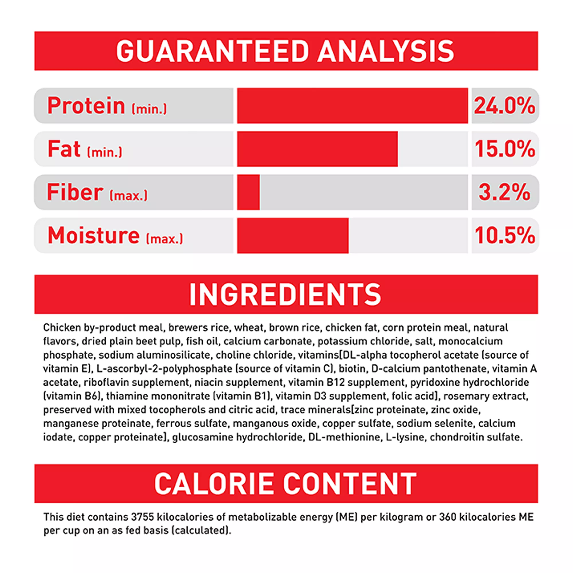 Guaranteed Analysis: Crude Protein (min.)24.0%, Crude Fat (min.)15.0%, Crude Fiber (max.)3.2%,