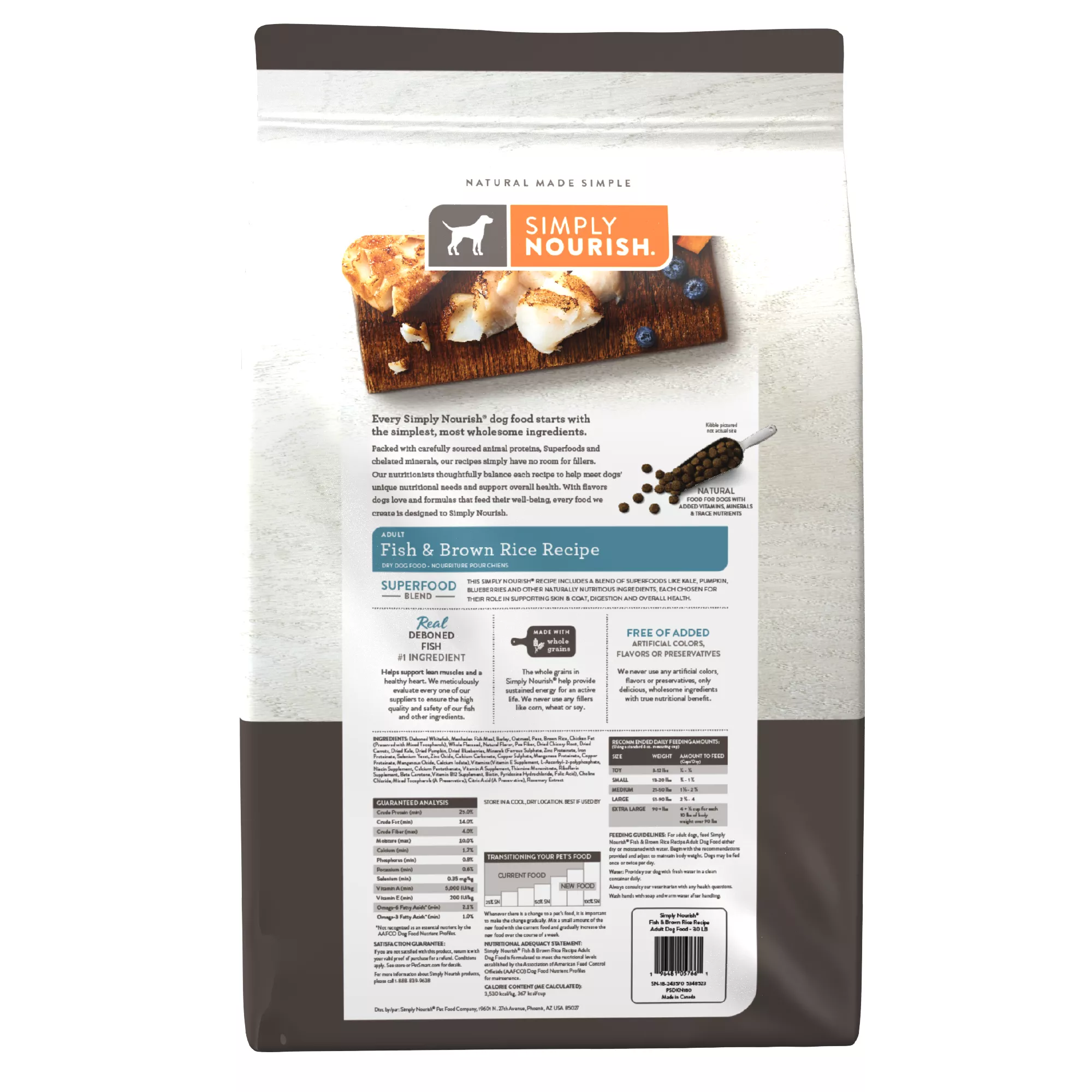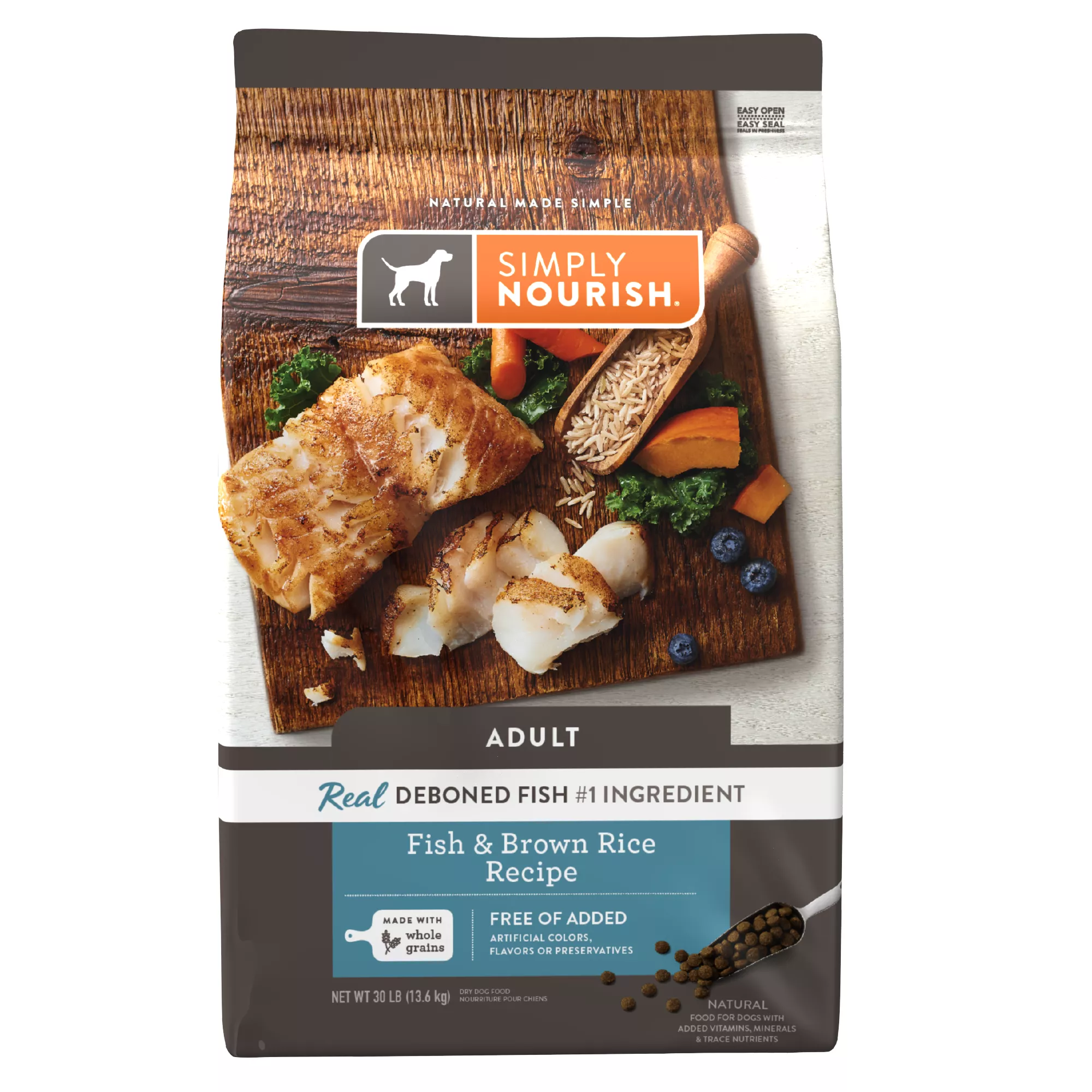 Simply Nourish Fish & Brown Rice Adult Dog Food includes a blend of superfoods like kale, pumpkin, blueberries and other naturally nutritious ingredients. Each of these ingredients was chosen for their role in supporting skin & coat, digestion and overall health. Only at PetSmart.