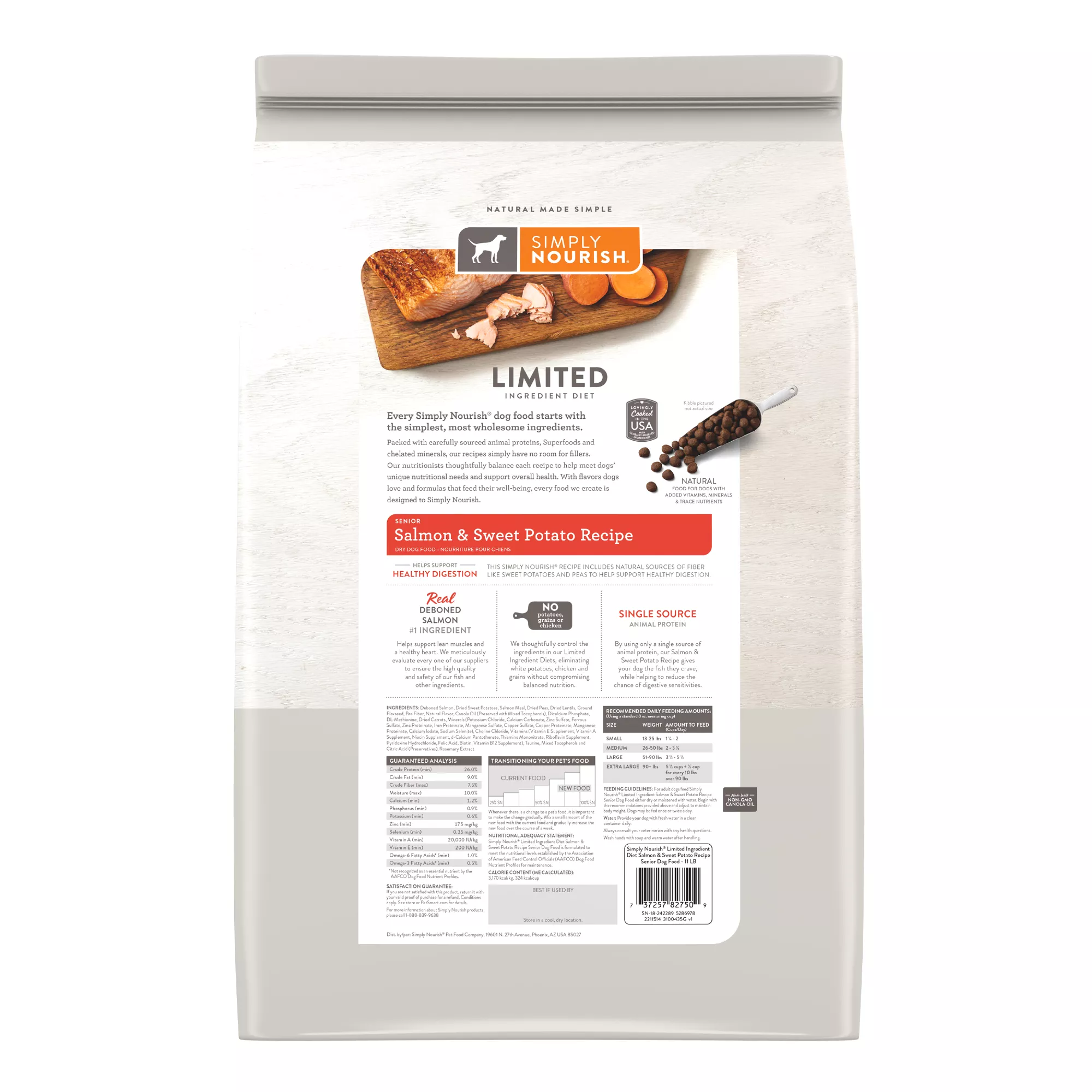 Simply Nourish Limited Ingredient Diet Salmon & Sweet Potato Recipe Senior Dog Food includes natural sources of fiber like sweet potatoes and peas to help support healthy digestion. By using deboned salmon as a single source of animal protein, this recipe gives your dog the fish they crave while helping to reduce the chance of digestive sensitivities.