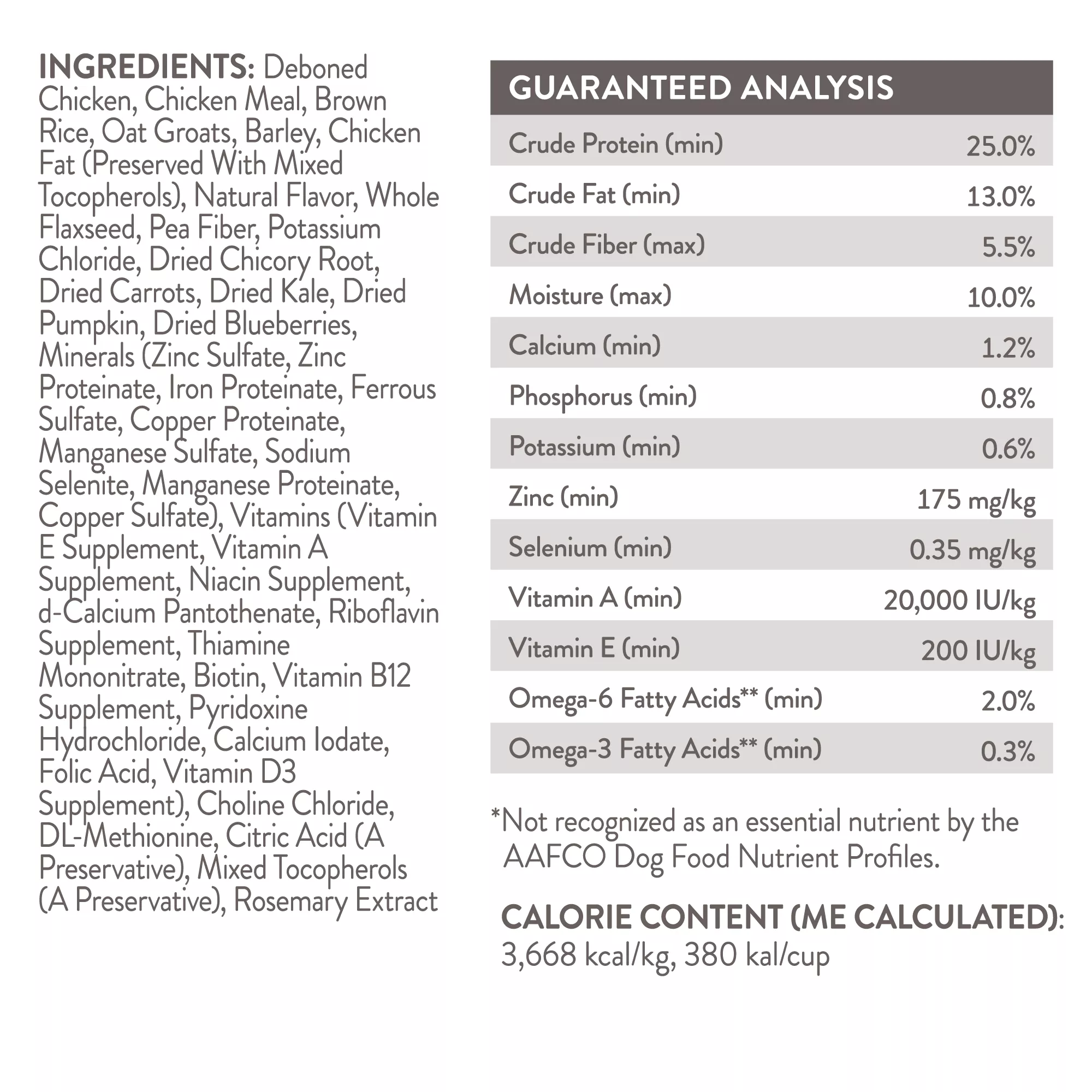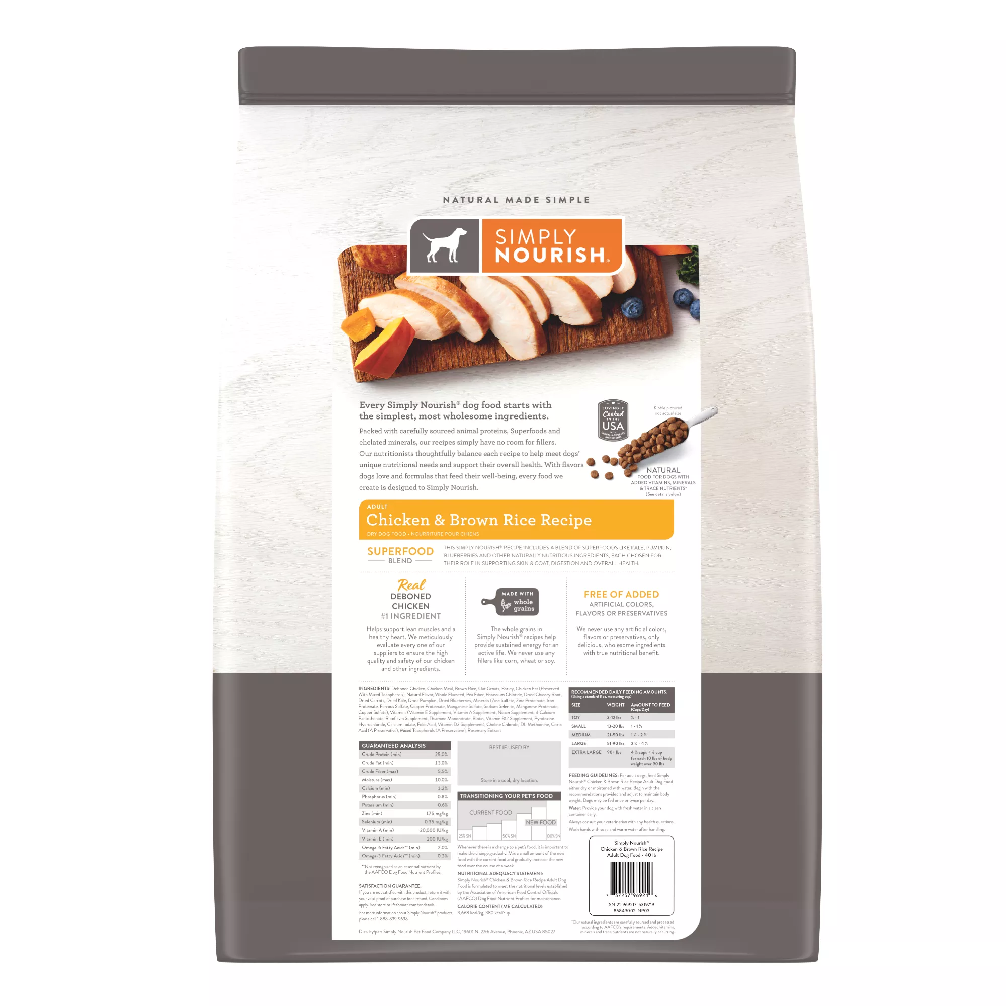 Simply Nourish Chicken & Brown Rice Recipe Adult Dog Food is packed with carefully sourced animal proteins, Superfoods and chelated minerals. Our recipes simply have no room for fillers. Our nutritionists thoughtfully balance each recipe to help meet dogs’ unique nutritional needs and support their overall health. With flavors dogs love and formulas that feed their well-being, every food we create is designed to Simply Nourish….