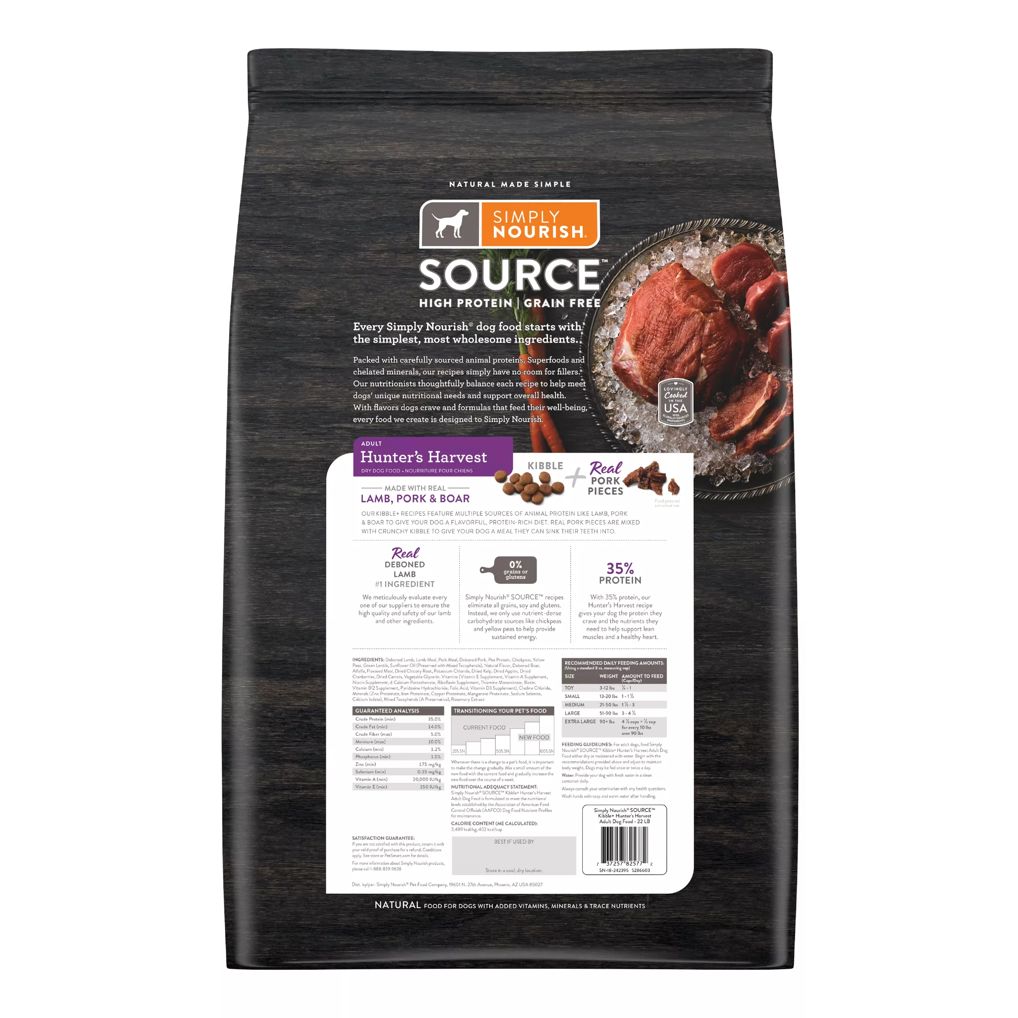 Simply Nourish Source Hunter’s Harvest Adult Dog Food feature multiple sources of animal protein like lamb, pork & boar to give your dog a flavorful, protein-rich diet. Real pork pieces are mixed with crunchy kibble to give your dog a meal they can sink their teeth into.
