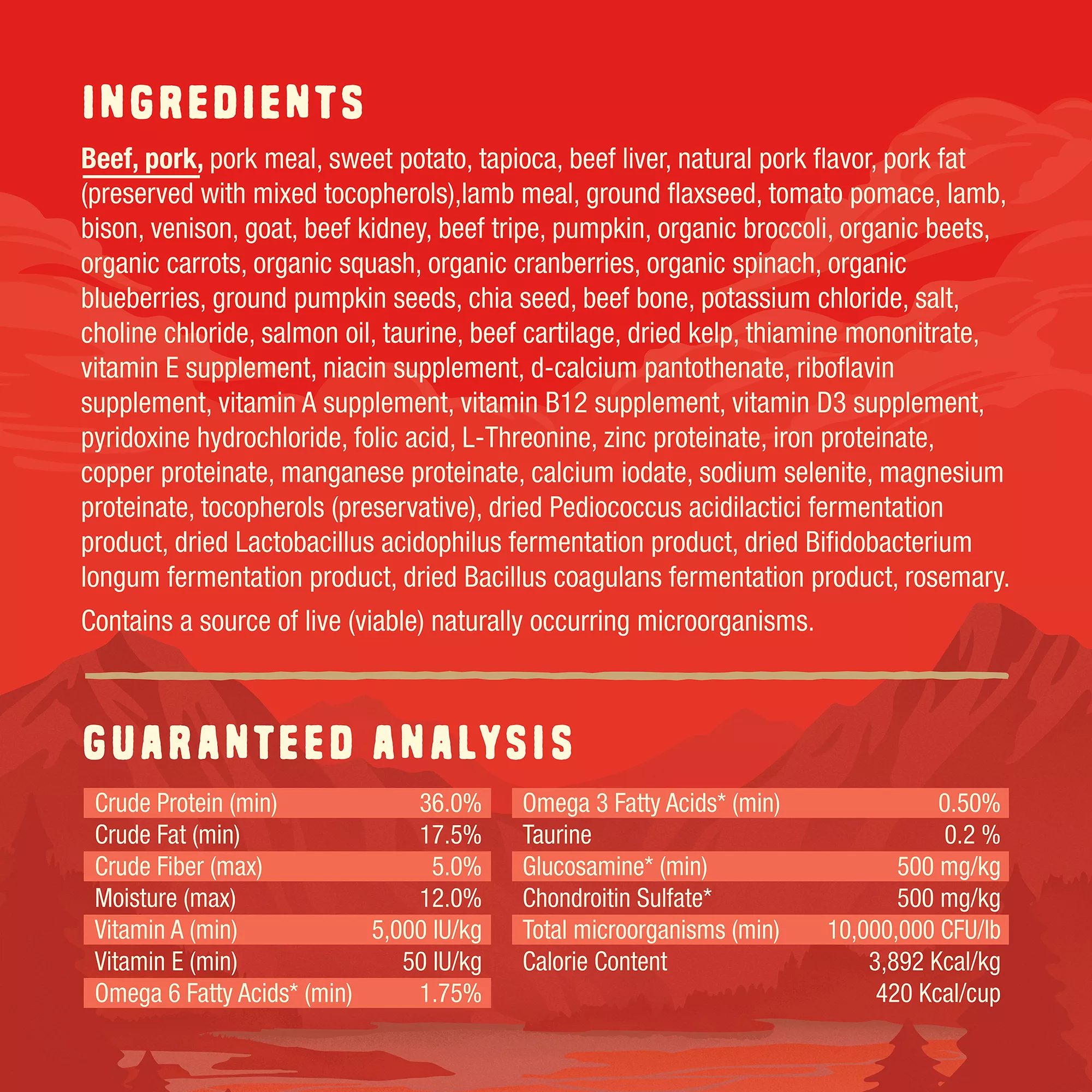 Ingredients: Beef, pork, pork meal, sweet potato, tapioca, beef liver, natural pork flavor, pork fat (preserved with mixed tocopherols), lamb meal, ground flaxseed, tomato pomace, lamb, bison, venison, goat, beef kidney, beef tripe, pumpkin, organic broccoli, organic beets, organic carrots, organic squash, organic cranberries, organic spinach, organic blueberries, ground pumpkin seeds, chia seed, beef bone, potassium chloride, salt, choline chloride, salmon oil, taurine, beef cartilage, dried kelp, thiamine mononitrate, vitamin E supplement, niacin supplement, d?calcium pantothenate, riboflavin supplement, vitamin A supplement, vitamin B12 supplement, vitamin D3 supplement, pyridoxine hydrochloride, folic acid, L?Threonine, zinc proteinate, iron proteinate, copper proteinate, manganese proteinate, calcium iodate, sodium selenite, magnesium proteinate, tocopherols (preservative), dried Pediococcus acidilactici fermentation product, dried Lactobacillus acidophilus fermentation product, dried Bifidobacterium longum fermentation product, dried Bacillus coagulans fermentation product, rosemary.Contains a source of live (viable) naturally occurring microorga