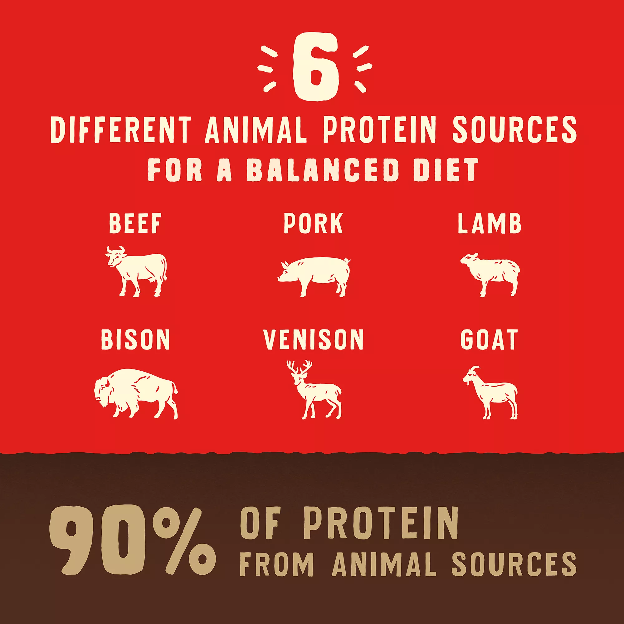 Features & Benefits: Meat?rich, whole?prey, low carb, recipes with each bite coated in freeze dried raw and blended with freeze?dried raw nuggets. Packed with meat from six poultry?free animal proteins ? beef, pork, lamb, bison, venison and goat. Grain?free recipe with no white potatoes or legumes. Nutrition of raw in every bite with freeze?dried raw coating, plus freeze?dried raw chunks90% of protein comes from animal sources. Nutrient dense recipe using “whole prey” ingredients ? muscle meat, organ meats and cartilage. Supports whole body health with the right blend of vitamins, minerals and amino acids. Includes probiotics for digestive health and taurine for heart health. No peas, lentils, by?product meals, artificial colors, flavors or preservatives added. Made in the USA.