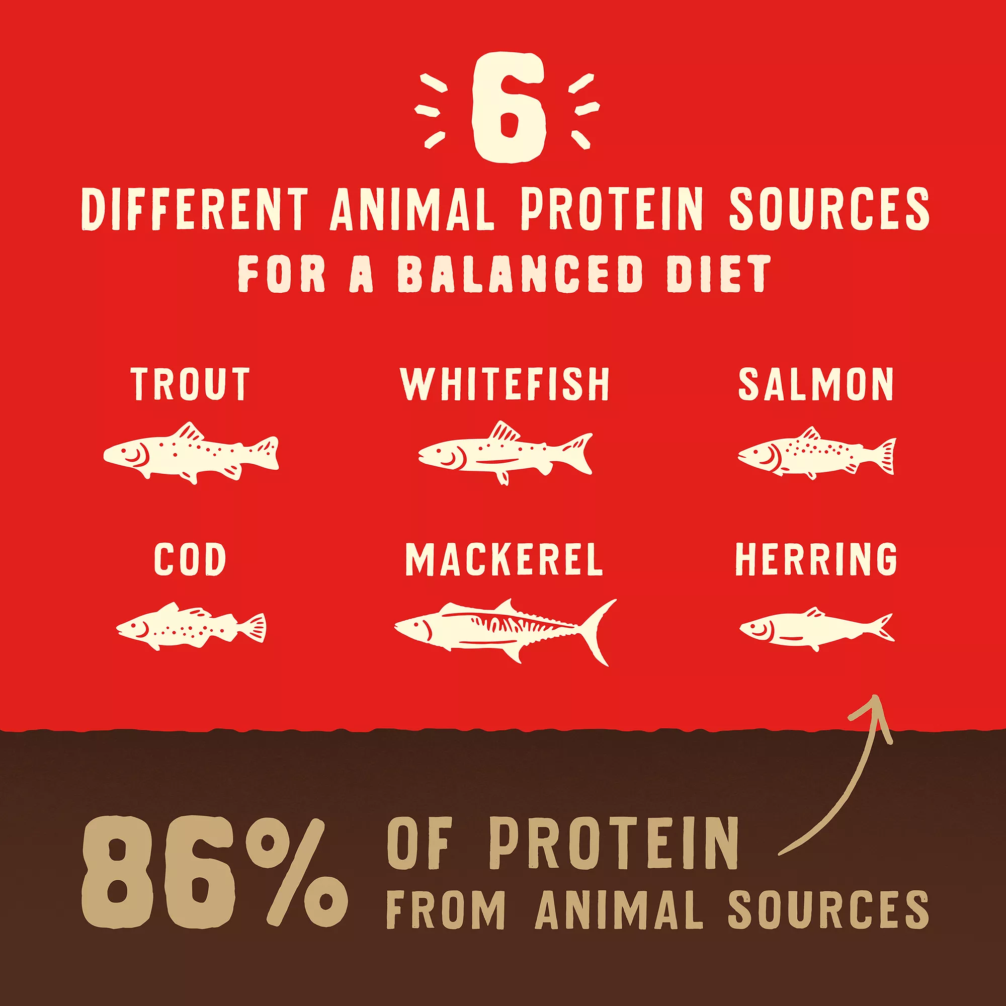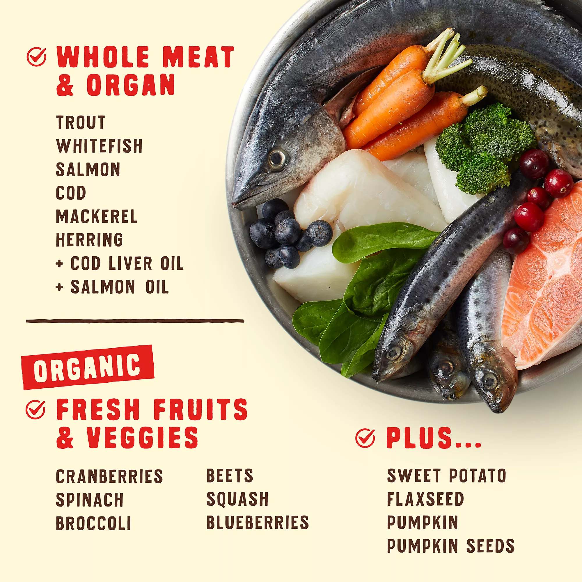 Features & Benefits: Meat?rich, whole?prey, low carb, recipes with each bite coated in freeze dried raw. Packed with meat from six poultry?free animal proteins ? trout, whitefish, salmon, cod, mackerel and herring. Grain?free* recipe with no white potatoes or legumes. Each bite is coated in delicious and nutritious freeze?dried raw 86% of protein comes from animal sources. Nutrient dense recipe using “whole prey” ingredients ? muscle meat, organ meats and cartilage. Supports whole body health with the right blend of vitamins, minerals and amino acids. Includes probiotics for digestive health and taurine for heart health. No peas, lentils, by?product meals, artificial colors, flavors or preservatives added. Made in the USA.