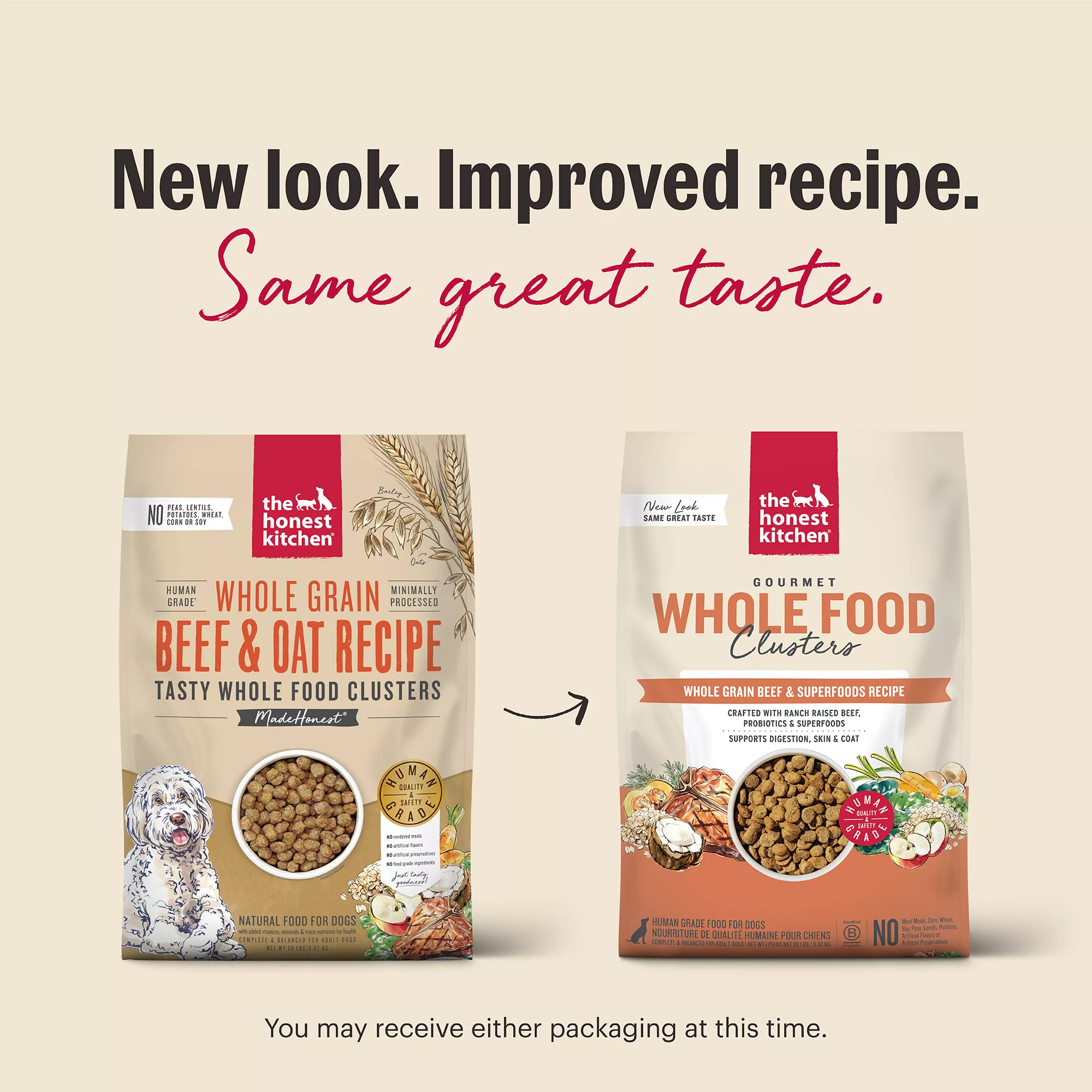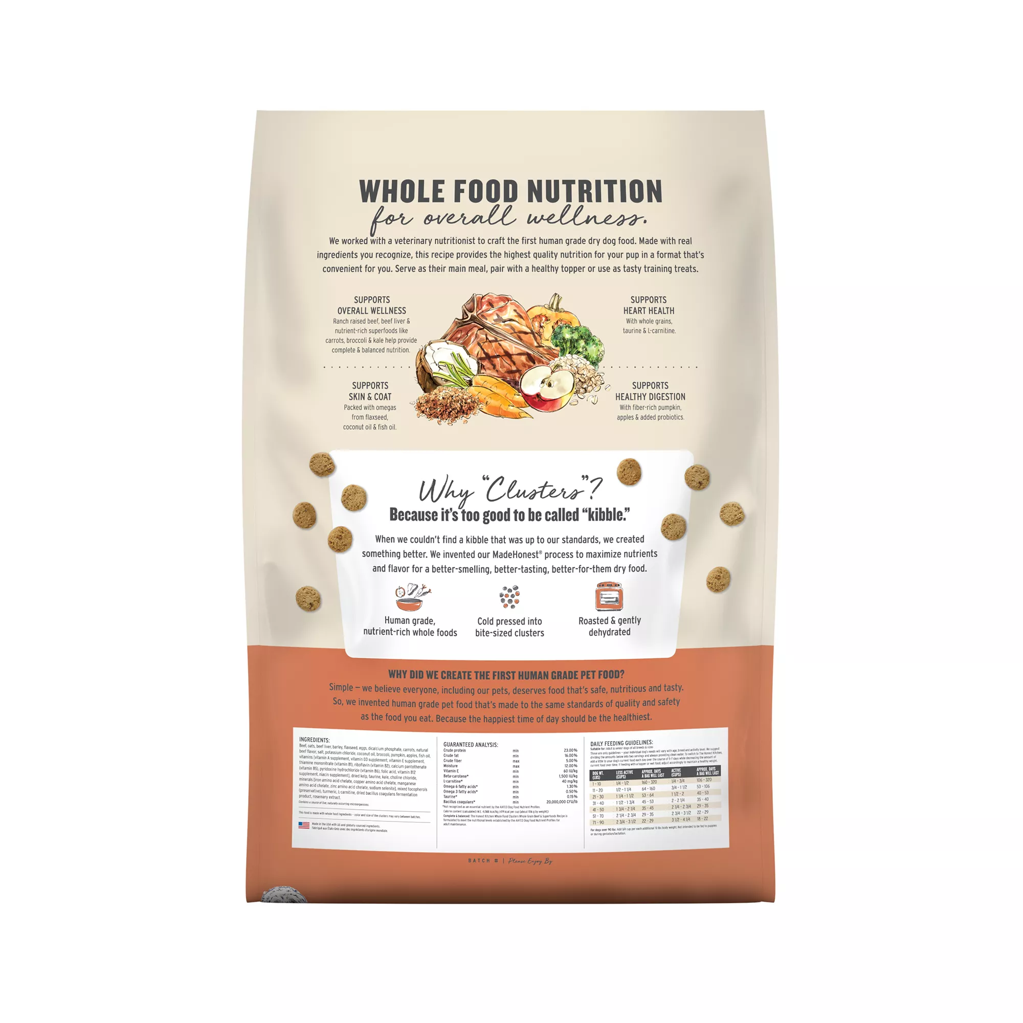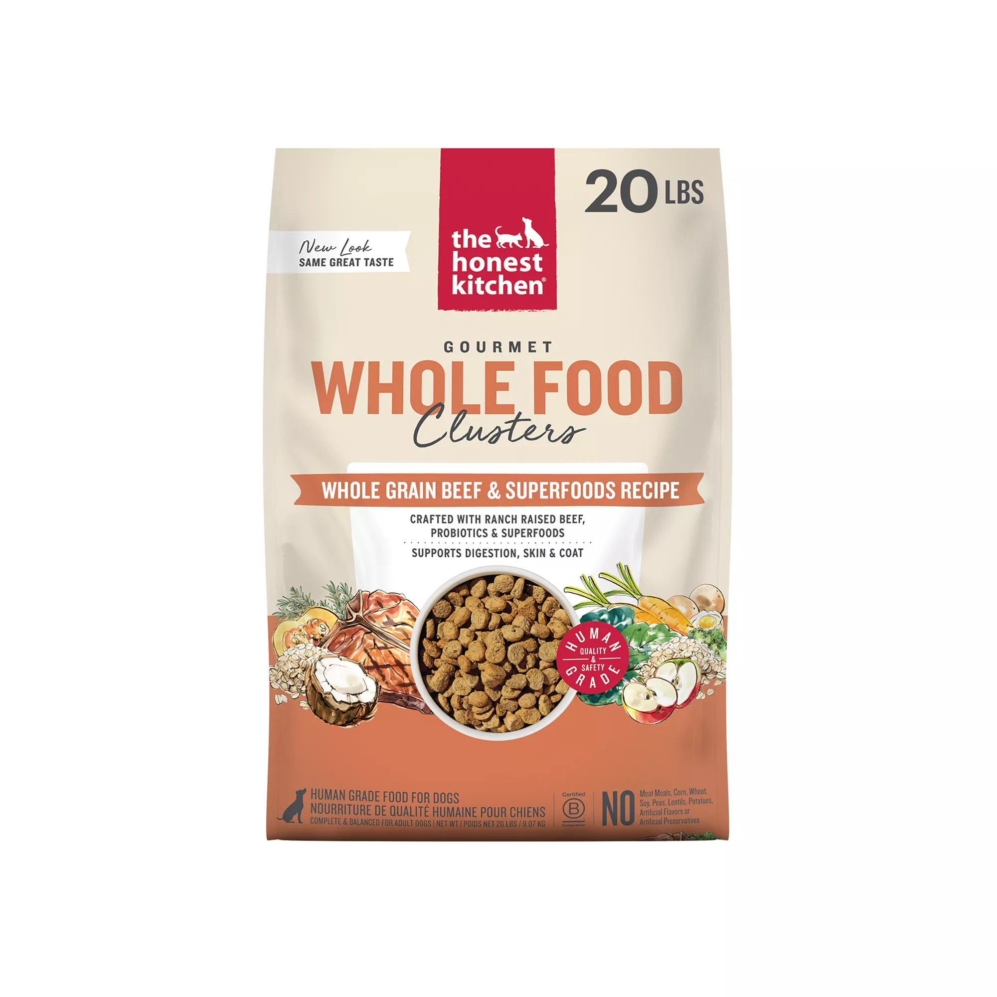 Description: Too good to be called kibble, you can see and smell the real food ingredients in every golden, roasted bite of The Honest Kitchen’s Whole Food Clusters. Crafted with a veterinary nutritionist as the first human grade dry dog food, this healthy recipe is made with ranch raised beef,