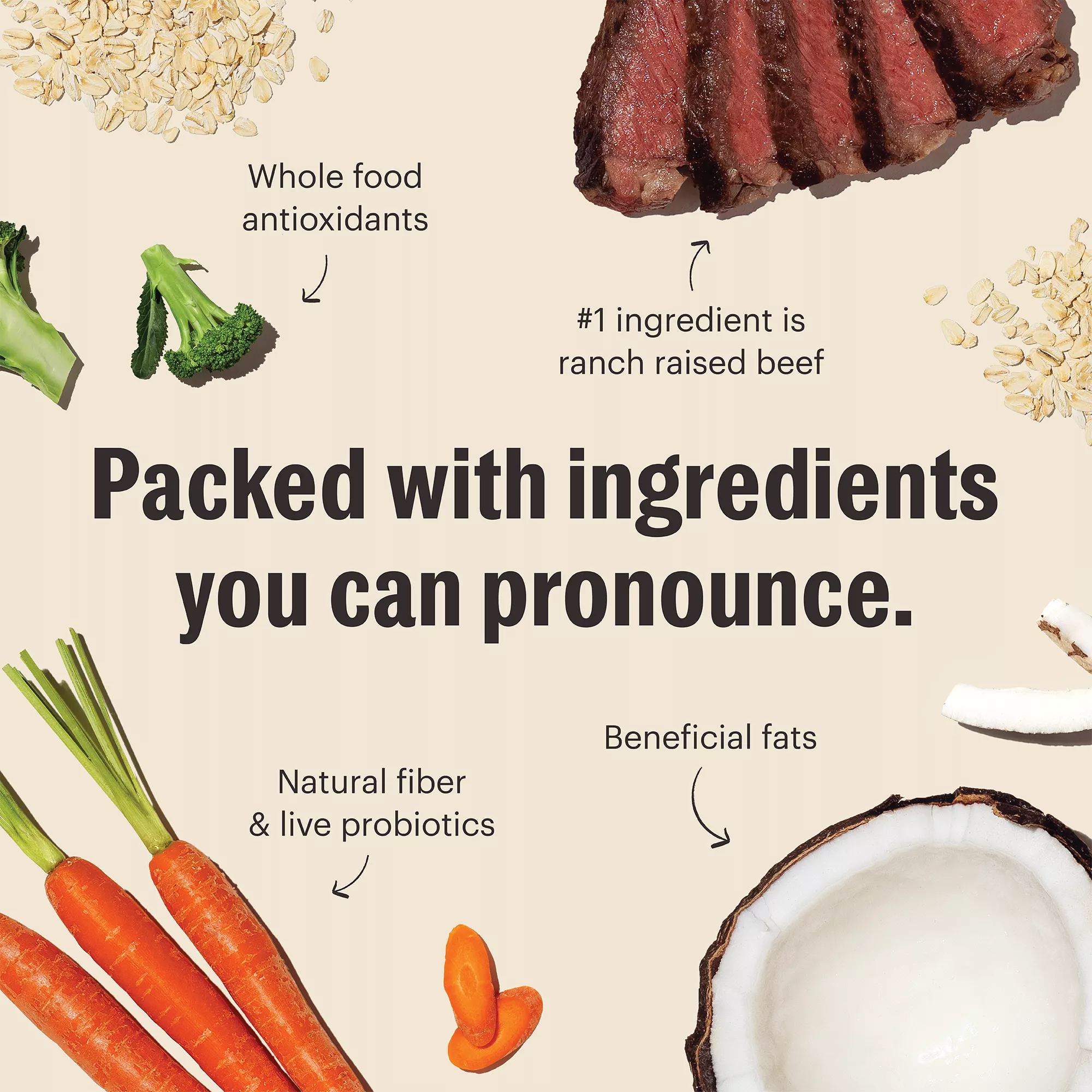 Features & Benefits: THE FIRST HUMAN GRADE DRY DOG FOOD Crafted with a vet nutritionist to provide the same human grade quality as fresh dog food in a convenient scoop and serve format. INGREDIENTS YOU CAN PRONOUNCE Made with healthy ingredients you recognize ? like ranch raised beef, carrots and broccoli ? that have been cold?pressed and roasted into bite?sized pieces. FOR ADULT DOGS Suitable for adult dogs of all breeds and sizes, including senior dogs PICKY PET PARENT APPROVED We never use GMO ingredients, meat meals, fillers (like corn, wheat or soy) or artificial ingredients. This recipe is also free of peas, legumes and lentils. MADE IN THE USA Proudly made in the USA with ingredients sourced from trusted suppliers around the world.