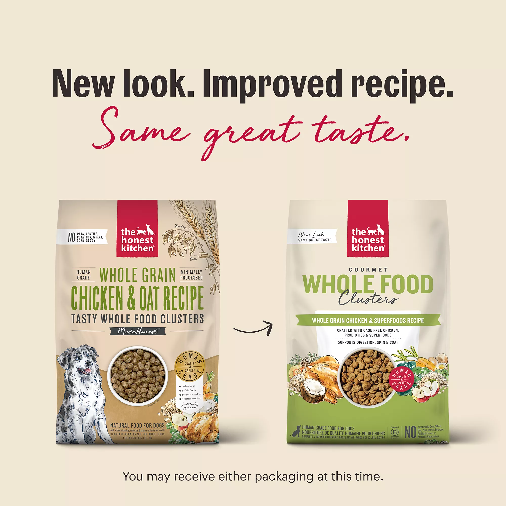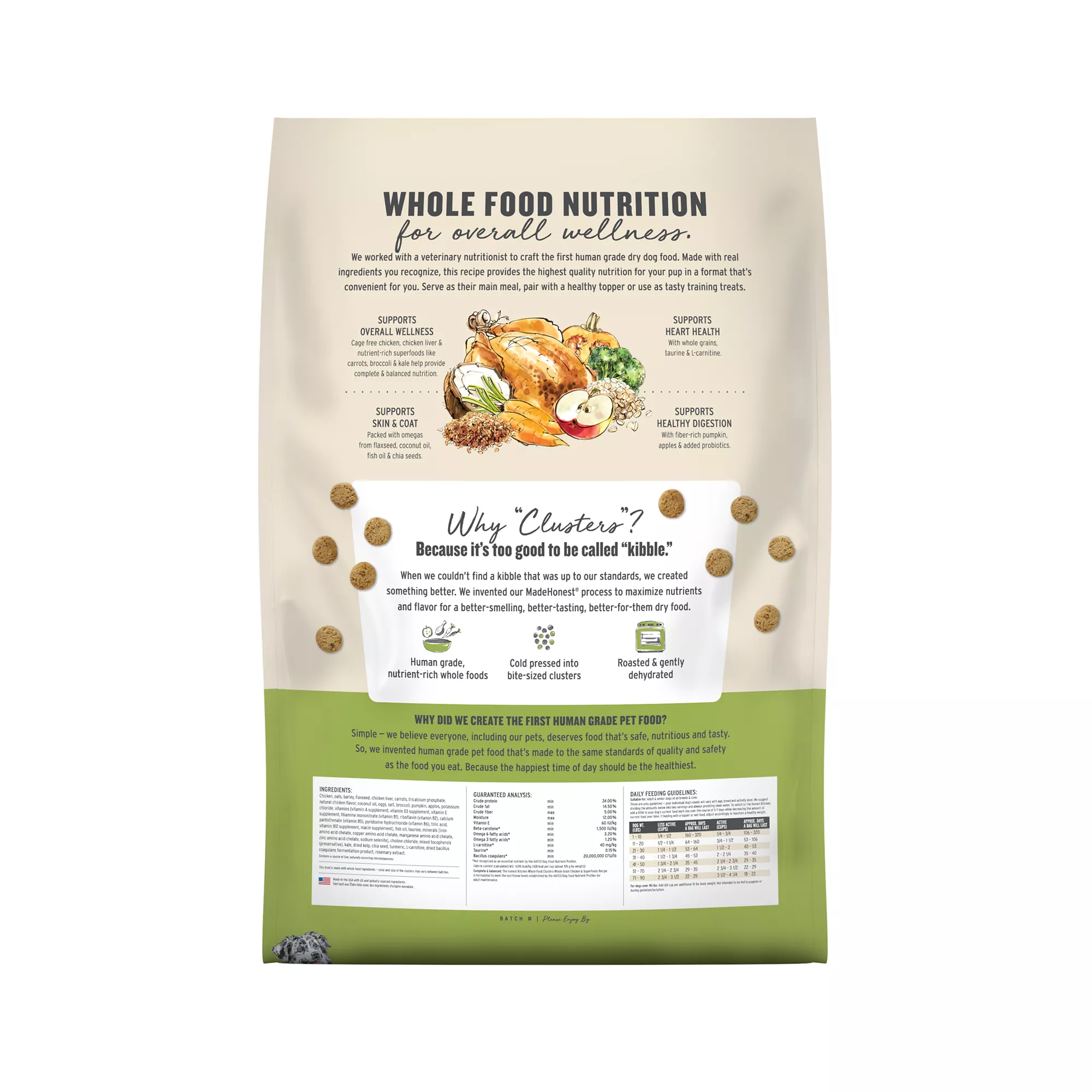 Description: Too good to be called kibble, you can see and smell the real food ingredients in every golden, roasted bite of The Honest Kitchen’s Whole Food Clusters. Crafted with a veterinary nutritionist as the first human grade dry dog food, this healthy recipe is made with cage free chicken, antioxident?rich whole foods like carrots and broccoli, and added probiotics to help support digestion. Even the pickiest pups love it! Serve as their main meal, pair with a healthy topper or use as tasty training treats.