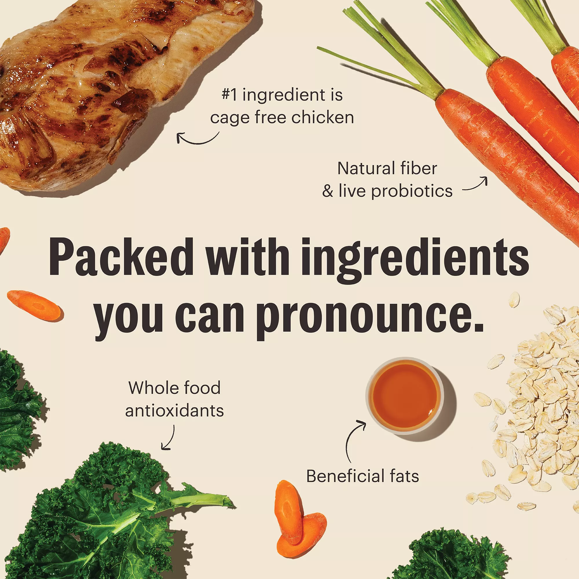 Features & Benefits: THE FIRST HUMAN GRADE DRY DOG FOOD Crafted with a vet nutritionist to provide the same human grade quality as fresh dog food in a convenient scoop and serve format. FOR SMALL BREED DOGS OF ALL AGES Crafted with a vet nutritionist to support small breed dogs of all life stages. It includes an extra boost of L?carnitine to help support healthy metabolism as well as balanced calories to support a healthy weight. INGREDIENTS YOU CAN PRONOUNCE Made with healthy ingredients you recognize ? like cage free chicken, carrots and broccoli ? that have been cold?pressed and roasted into bite?sized pieces. PICKY PET PARENT APPROVED We never use GMO ingredients, meat meals, fillers (like corn, wheat or soy) or artificial ingredients. MADE IN THE USA Our foods are made in the USA with ingredients sourced from trusted suppliers from around the world.