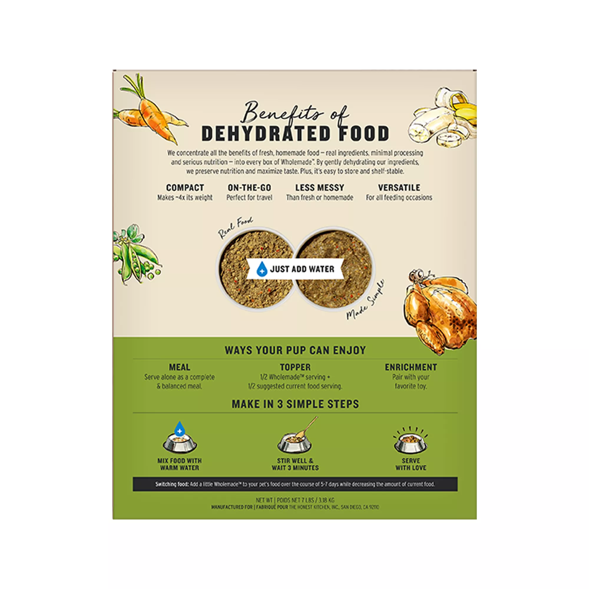 MAKES 28 LBS OF FOOD Just add water to make up to 28 pounds of real food that can be served as a full meal or healthy topper, or paired with a lick mat or enrichment toy.