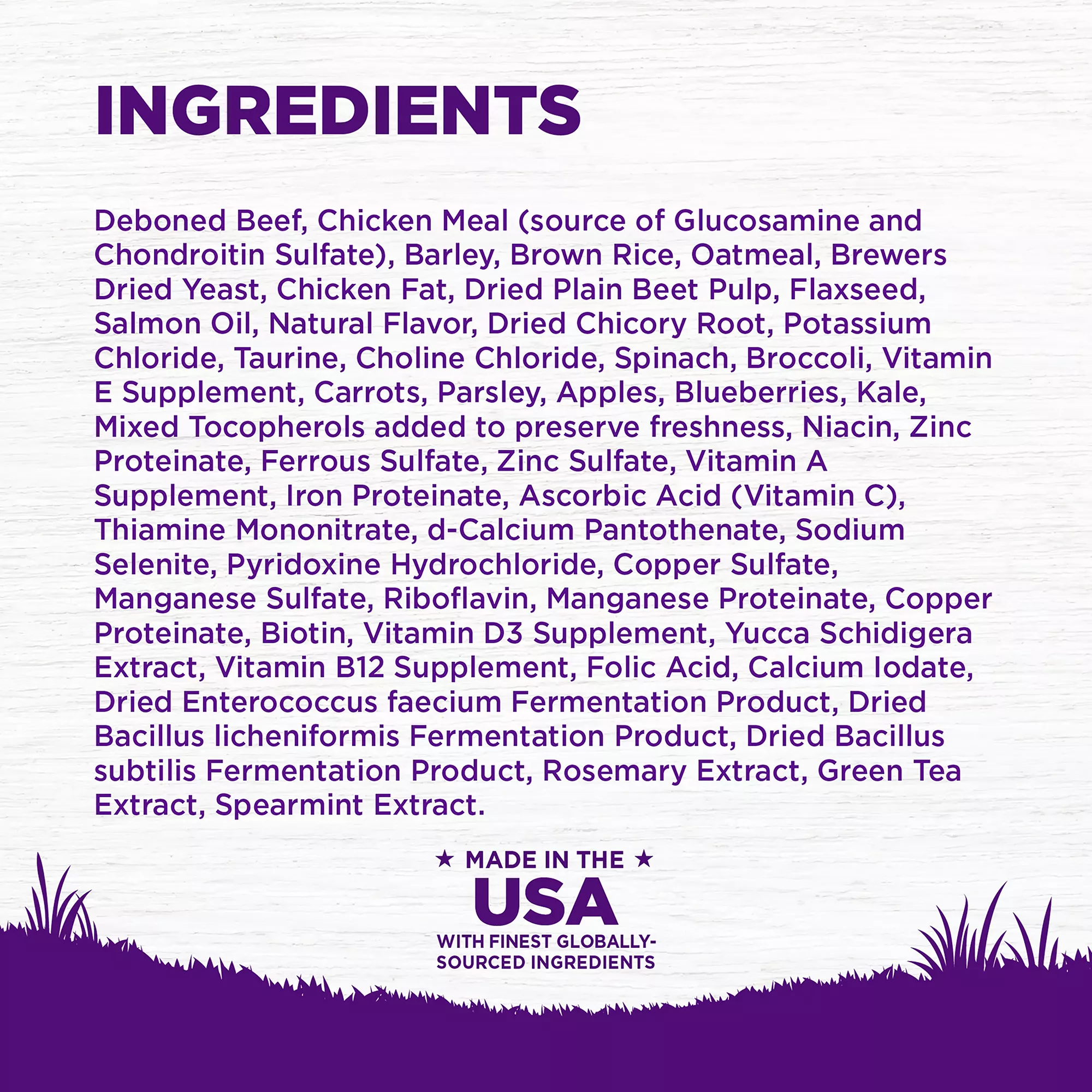 Ingredients: Deboned Beef, Chicken Meal (source of Glucosamine and Chondroitin Sulfate), Barley, Brown Rice, Oatmeal, Brewers Dried Yeast, Chicken Fat, Dried Plain Beet Pulp, Flaxseed, Salmon Oil, Natural Flavor, Dried Chicory Root, Potassium Chloride, Taurine, Choline Chloride, Spinach, Broccoli, Vitamin E Supplement, Carrots, Parsley, Apples, Blueberries, Kale, Mixed Tocopherols added to preserve freshness, Niacin, Zinc Proteinate, Ferrous Sulfate, Zinc Sulfate, Vitamin A Supplement, Iron Proteinate, Ascorbic Acid (Vitamin C), Thiamine Mononitrate, d?Calcium Pantothenate, Sodium Selenite, Pyridoxine Hydrochloride, Copper Sulfate, Manganese Sulfate, Riboflavin, Manganese Proteinate, Copper Proteinate, Biotin, Vitamin D3 Supplement, Yucca Schidigera Extract, Vitamin B12 Supplement, Folic Acid, Calcium Iodate, Dried Enterococcus faecium Fermentation Product, Dried Bacillus licheniformis Fermentation Product, Dried Bacillus subtilis Fermentation Product, Rosemary Extract, Green Tea Extract, Spearmint Extract. This is a naturally preserved product.