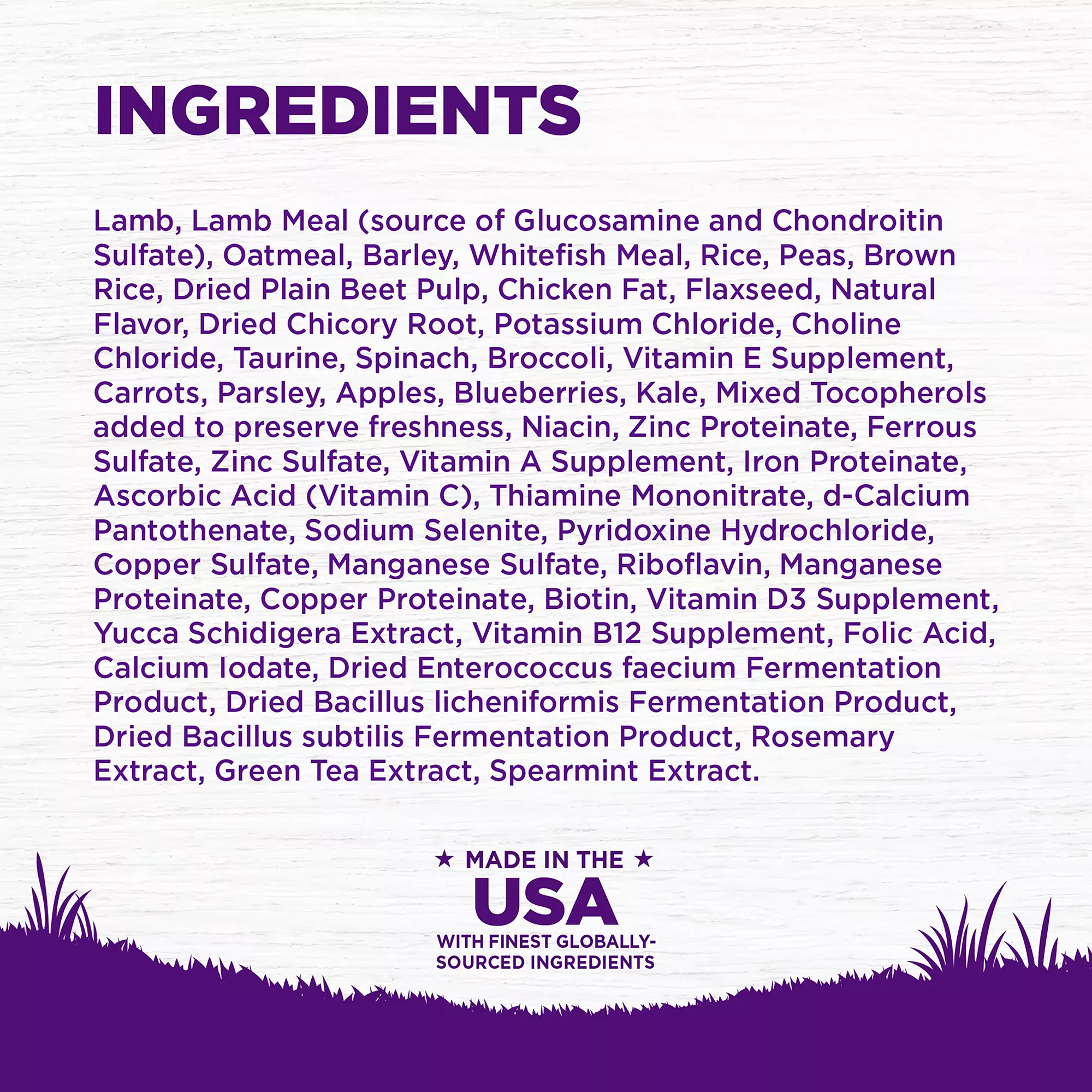 Ingredients: INGREDIENTS: Lamb, Lamb Meal (source of Glucosamine and Chondroitin Sulfate), Oatmeal, Barley, Whitefish Meal, Rice, Peas, Brown Rice, Dried Plain Beet Pulp, Chicken Fat, Flaxseed, Natural Flavor, Dried Chicory Root, Potassium Chloride, Choline Chloride, Taurine, Spinach, Broccoli, Vitamin E Supplement, Carrots, Parsley, Apples, Blueberries, Kale, Mixed Tocopherols added to preserve freshness, Niacin, Zinc Proteinate, Ferrous Sulfate, Zinc Sulfate, Vitamin A Supplement, Iron Proteinate, Ascorbic Acid (Vitamin C), Thiamine Mononitrate, d?Calcium Pantothenate, Sodium Selenite, Pyridoxine Hydrochloride, Copper Sulfate, Manganese Sulfate, Riboflavin, Manganese Proteinate, Copper Proteinate, Biotin, Vitamin D3 Supplement, Yucca Schidigera Extract, Vitamin B12 Supplement, Folic Acid, Calcium Iodate, Dried Enterococcus faecium Fermentation Product, Dried Bacillus licheniformis Fermentation Product, Dried Bacillus subtilis Fermentation Product, Rosemary Extract, Green Tea Extract, Spearmint Extract.This is a naturally preserved product