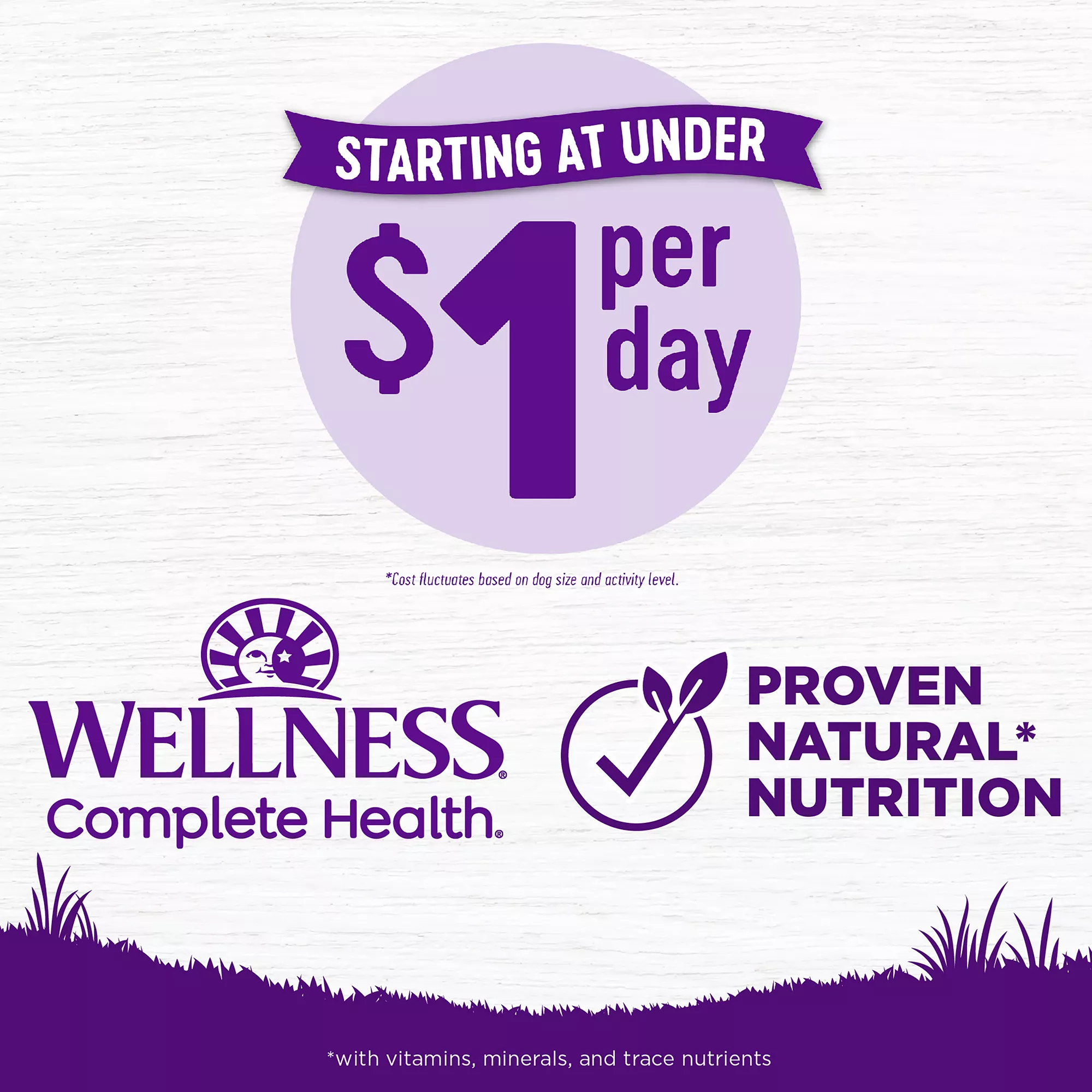 Description: Wellness Complete Health natural pet food is made with carefully chosen, authentic ingredients for everyday health. A nutrient?rich blend of whole foods to fulfill the unique health needs of your dog, providing whole?body nutritional support to promote complete health. Supported by omega fatty acids, antioxidants, glucosamine, probiotics and taurine for a healthy heart. Scientifically crafted by our team of veterinarians and scientists to provide nutrition for a lifetime of wellbein…