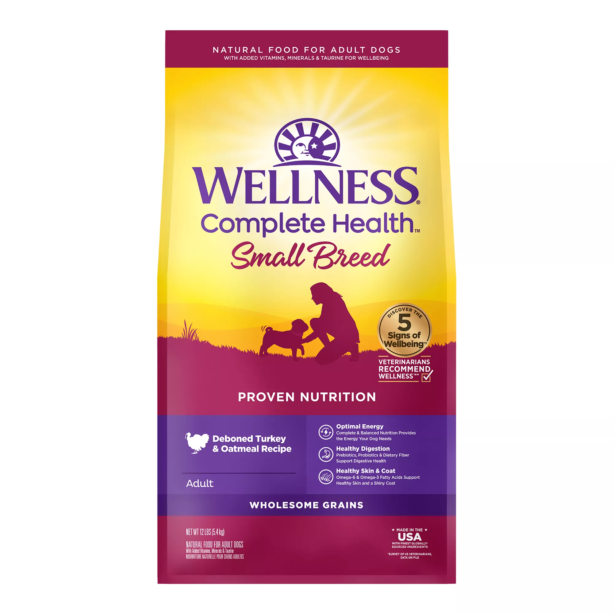 Description: Wellness Complete Health Natural Dry Dog Food, Small Breed Turkey & Oatmeal Recipe, is healthy, natural dog food for adult small breed dogs featuring a smaller kibble size for smaller mouths and made with carefully chosen, authentic ingredients for everyday health and provide an optimal balance of nutrient?rich whole foods to fulfill the unique health needs of your dog, providing whole?body nutritional support to promote complete health. Wellness Complete Health Dry Dog Food supports your dog’s balanced natural nutrition, healthy body mass, overall health and vitality, optimal nutrient absorption, bone and joint health and digestive health, all with natural and delicious ingredients to provide a guaranteed great taste that dogs love.