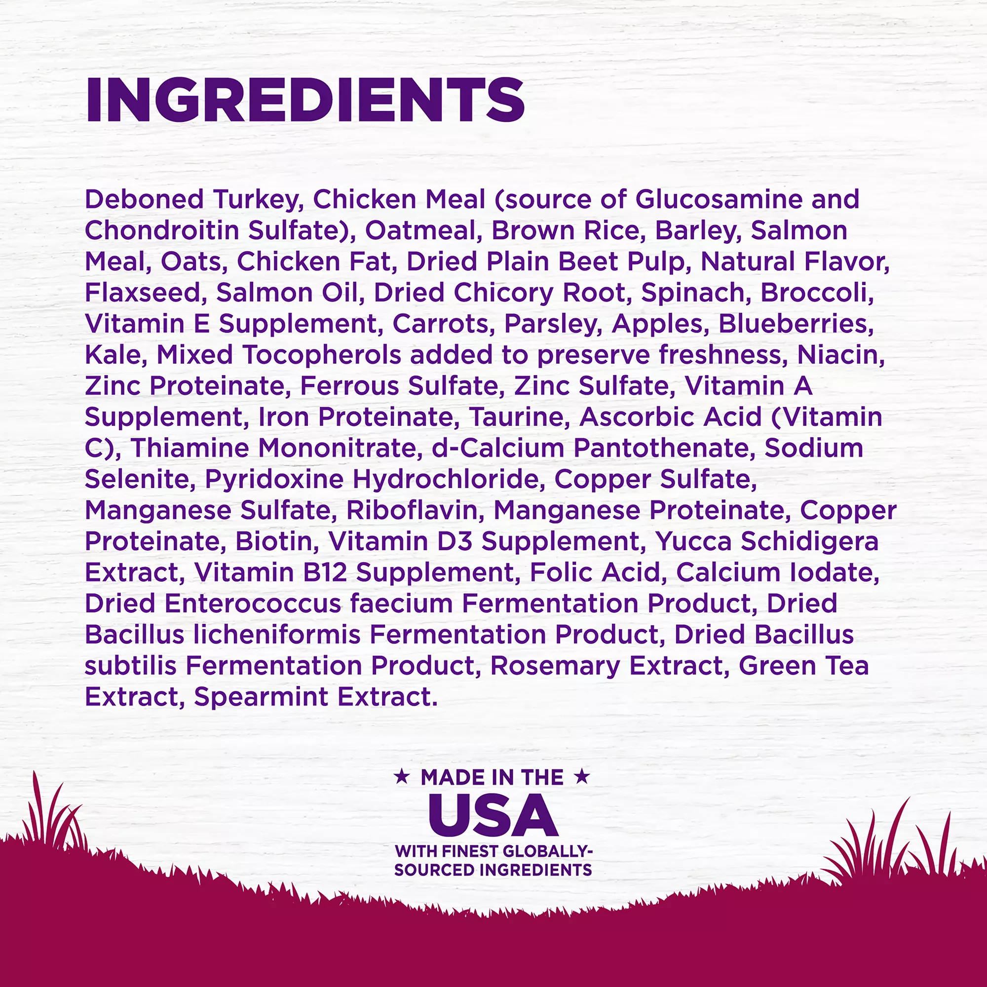 Ingredients: Deboned Turkey, Chicken Meal (source of Glucosamine and Chondroitin Sulfate), Oatmeal, Brown Rice, Barley, Salmon Meal, Oats, Chicken Fat, Dried Plain Beet Pulp, Natural Flavor, Flaxseed, Salmon Oil, Dried Chicory Root, Spinach, Broccoli, Vitamin E Supplement, Carrots, Parsley, Apples, Blueberries, Kale, Mixed Tocopherols added to preserve freshness, Niacin, Zinc Proteinate, Ferrous Sulfate, Zinc Sulfate, Vitamin A Supplement, Iron Proteinate, Taurine, Ascorbic Acid (Vitamin C), Thiamine Mononitrate, d?Calcium Pantothenate, Sodium Selenite, Pyridoxine Hydrochloride, Copper Sulfate, Taurine, Manganese Sulfate, Riboflavin, Manganese Proteinate, Copper Proteinate, Biotin, Vitamin D3 Supplement, Yucca Schidigera Extract, Vitamin B12 Supplement, Folic Acid, Calcium Iodate, Dried Enterococcus faecium Fermentation Product, Dried Bacillus licheniformis Fermentation Product, Dried Bacillus subtilis Fermentation Product, Rosemary Extract, Green Tea Extract, Spearmint Extract. This is a naturally preserved product