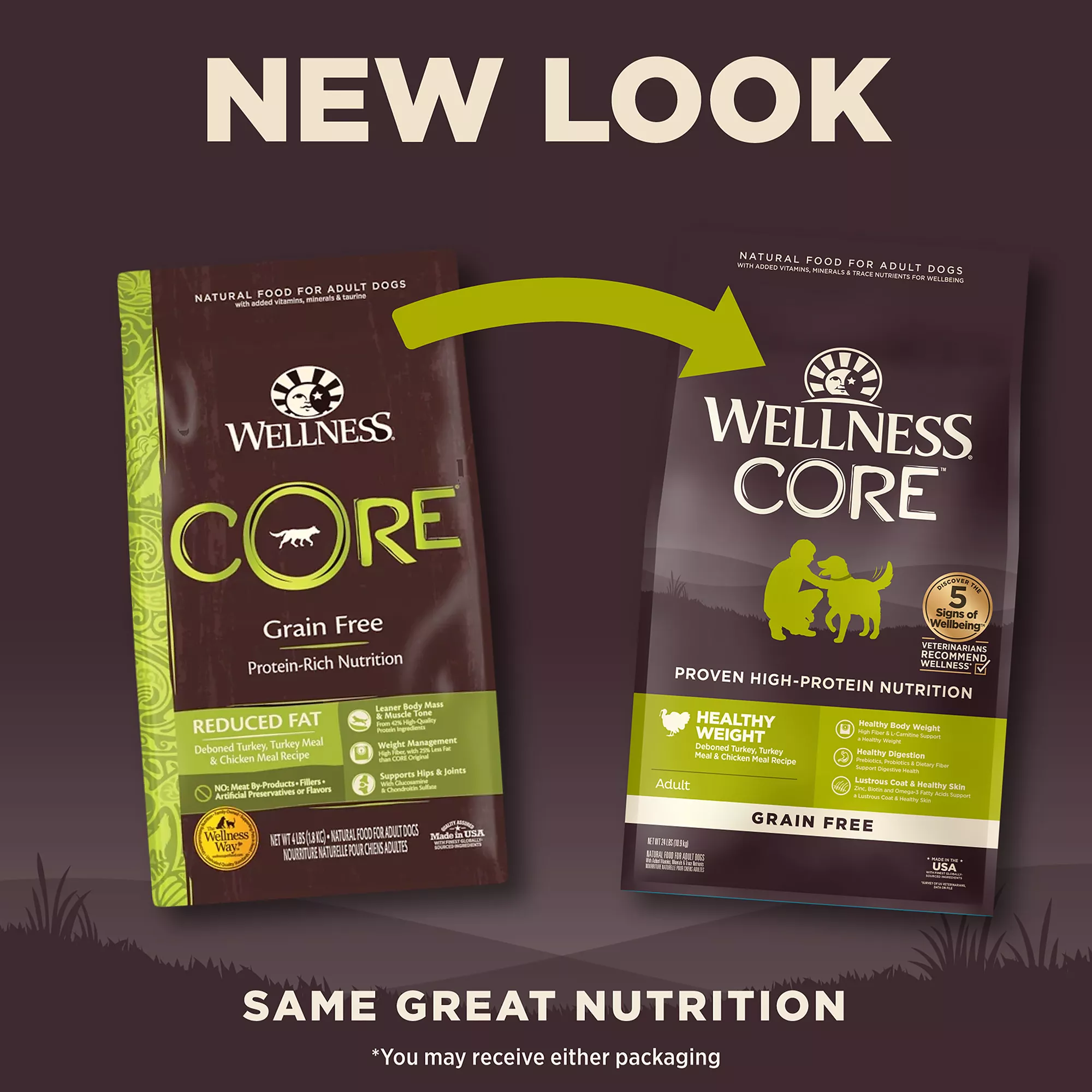 Description: Wellness CORE Natural Grain Free Dog Food Reduced Fat has 25% less fat than CORE Original. This blanaced, grain?free dry food for dogs is specially formulated to help your dog maintain a healthy weight using the power of protein and a reduced fat recipe. This nutrient?rich gain free dry dog food is designed to encourage lean body mass and muscle tone and support whole body health. It is designed with no meat by?products or fillers, grain, corn, soy, wheat?gluten or artificial preservatives, colors or flavors.
