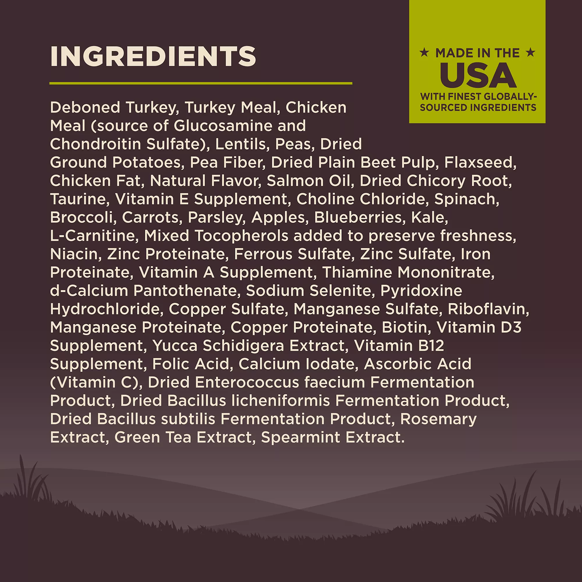 Ingredients: Deboned Turkey, Turkey Meal, Chicken Meal, Potatoes, Peas, Dried Ground Potatoes, Pea Fiber, Tomato Pomace, Chicken Liver, Chicken Fat (preserved with Mixed Tocopherols), Natural Chicken Flavor, Ground Flaxseed, Salmon Oil, Spinach, Vitamin E Supplement, Broccoli, Carrots, Choline Chloride, Parsley, Apples, Blueberries, Kale, Sweet Potatoes, Taurine, Mixed Tocopherols added to preserve freshness, Zinc Proteinate, Zinc Sulfate, Glucosamine Hydrochloride, Chondroitin Sulfate, Calcium Carbonate, Niacin, Ferrous Sulfate, Iron Proteinate, Beta?Carotene, Vitamin A Supplement, Copper Sulfate, Thiamine Mononitrate, Copper Proteinate, Manganese Proteinate, Manganese Sulfate, d?Calcium Pantothenate, Sodium Selenite, Pyridoxine Hydrochloride, Riboflavin, Chicory Root Extract, Yucca Schidigera Extract, Vitamin D3 Supplement, Biotin, Calcium Iodate, Vitamin B12 Supplement, Folic Acid, Ascorbic Acid (Vitamin C), Dried Lactobacillus plantarum Fermentation Product, Dried Enterococcus faecium Fermentation Product, Dried Lactobacillus casei Fermentation Product, Dried Lactobacillus acidophilus Fermentation Product, Rosemary Extract, Green Tea Extract, Spearmint Extract.